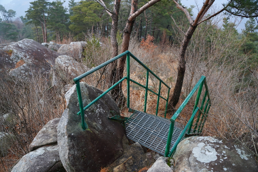 바위를 내려서면 녹색 철계단이 나옵니다.