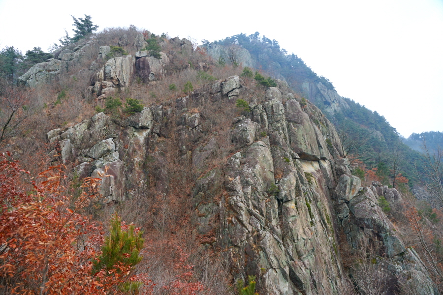 병풍을 두른 바위 사이를 올라갑니다.