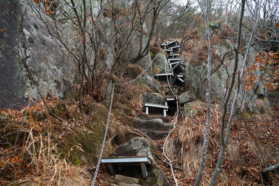 쇠사슬과 철계단이 놓인 바위를 지나