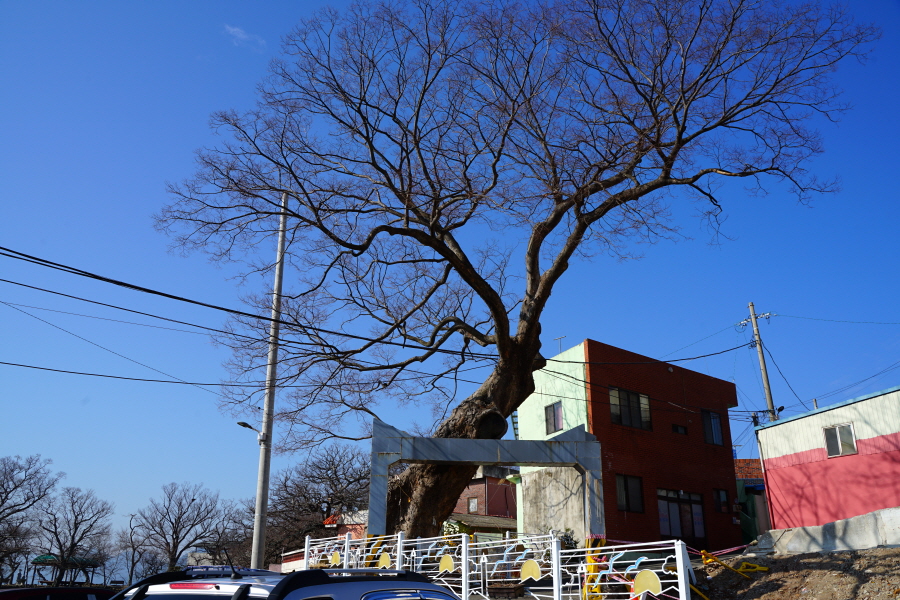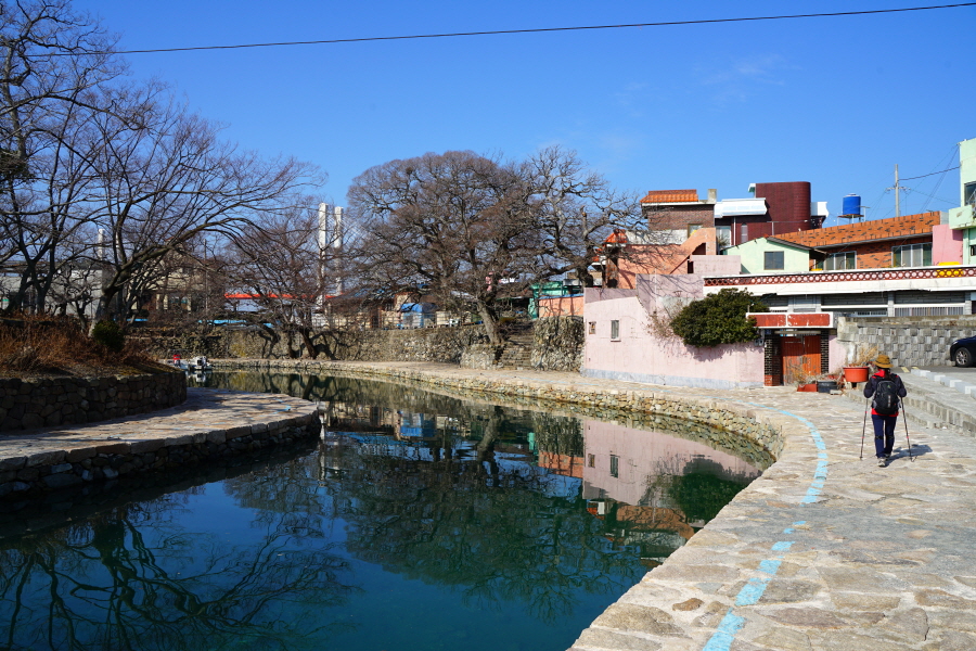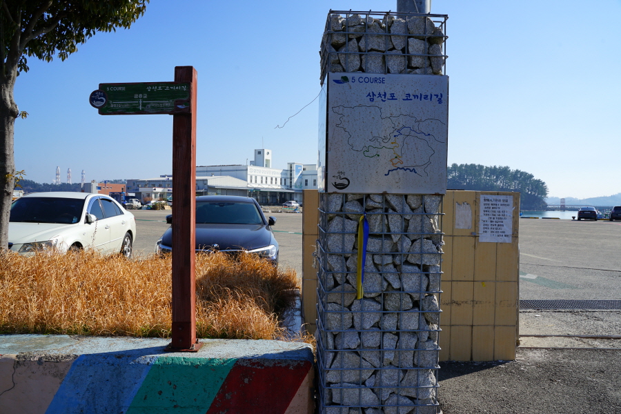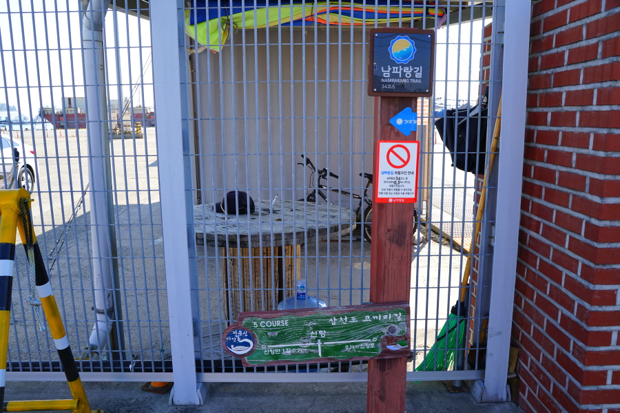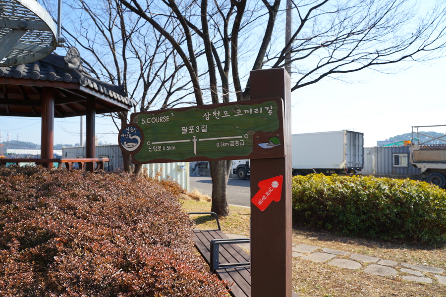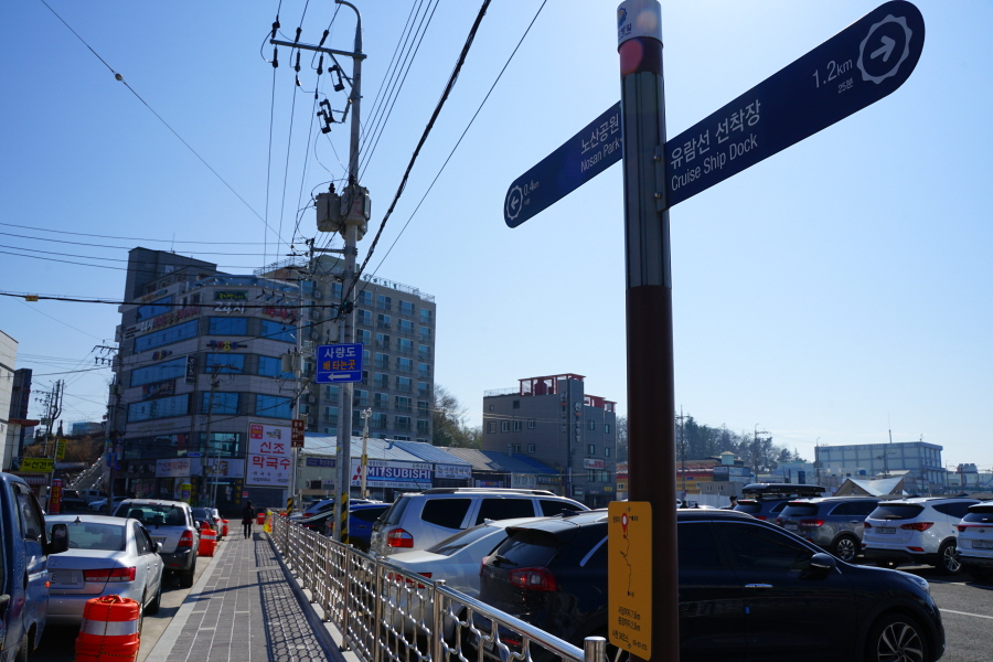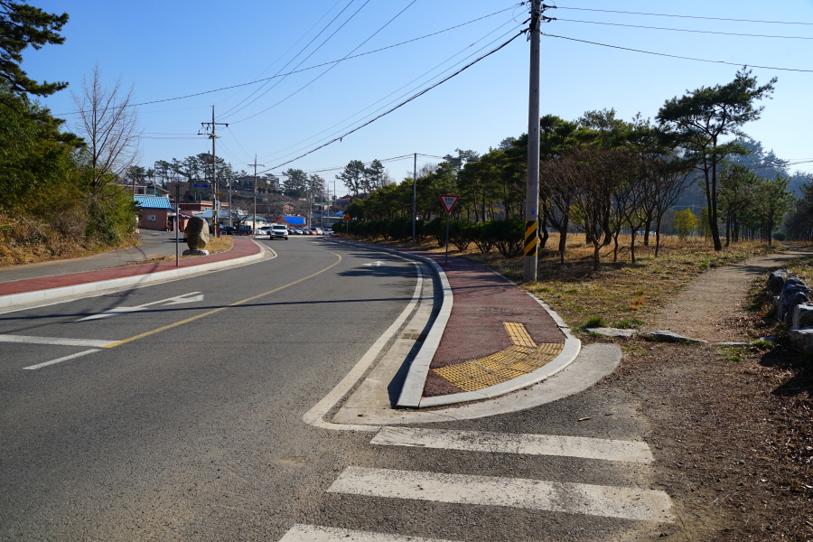 왼쪽으로 꺾어 신항만 1길(0.2㎞) 이정표를 따라