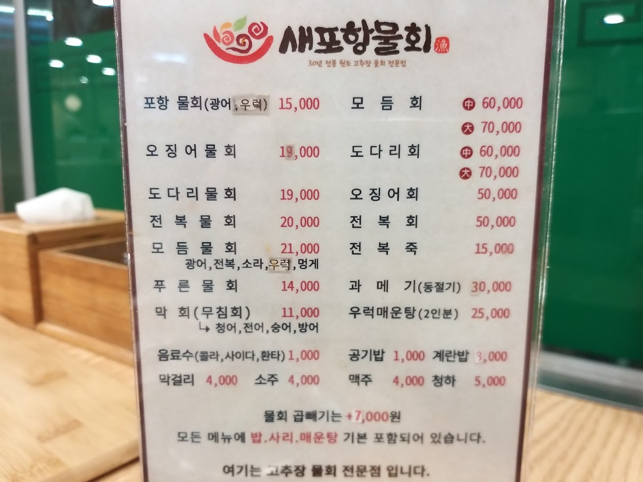 새포항물회 메뉴판을 보니까