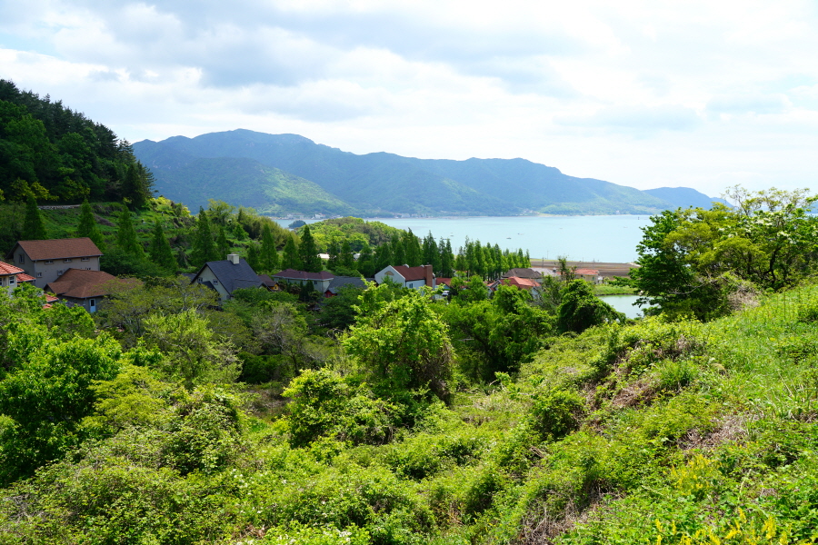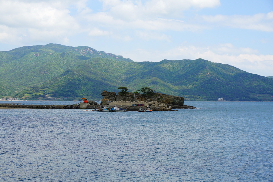 왼쪽 앵강만에 뜬 둥근 섬은 노도입니다.