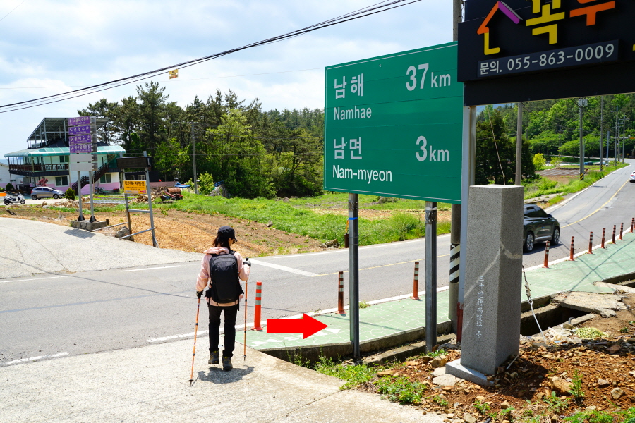 도로(남해 37㎞·남면3㎞ 표지판)에서
