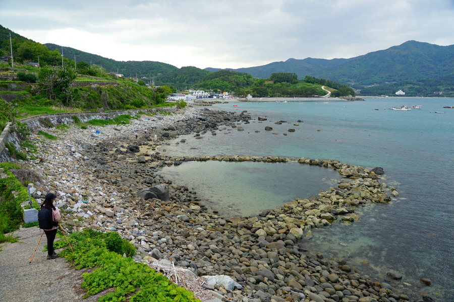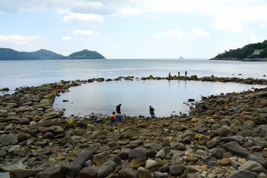 몽돌 해변에 돌을 둘러 물고기를 잡는