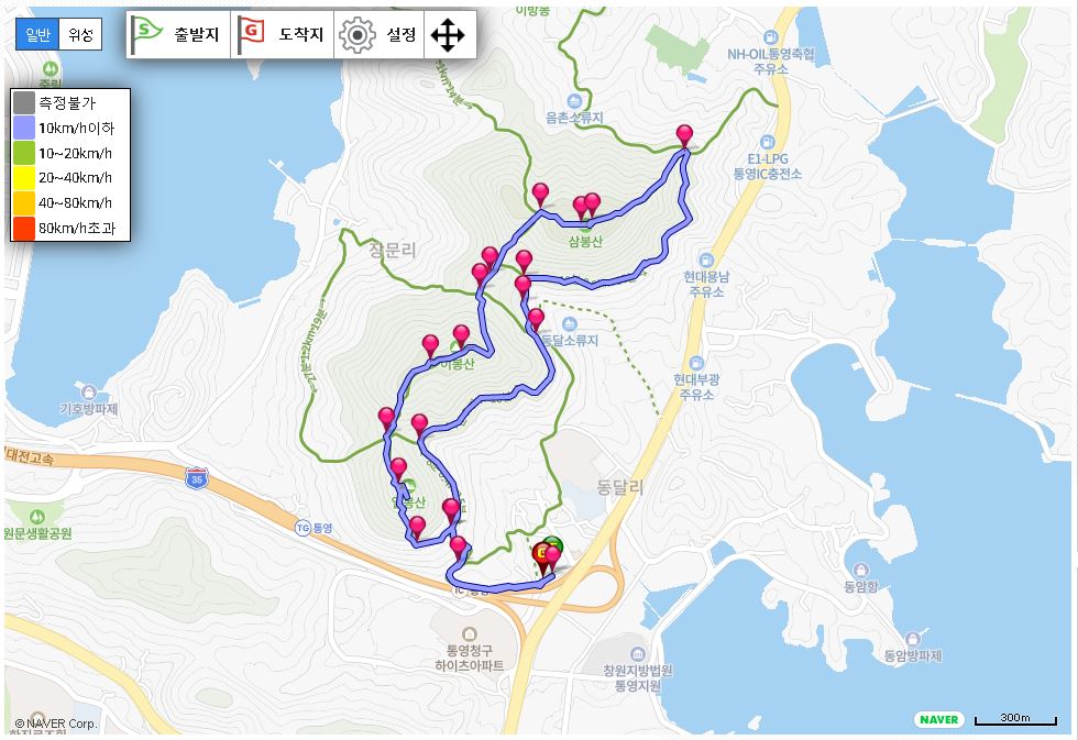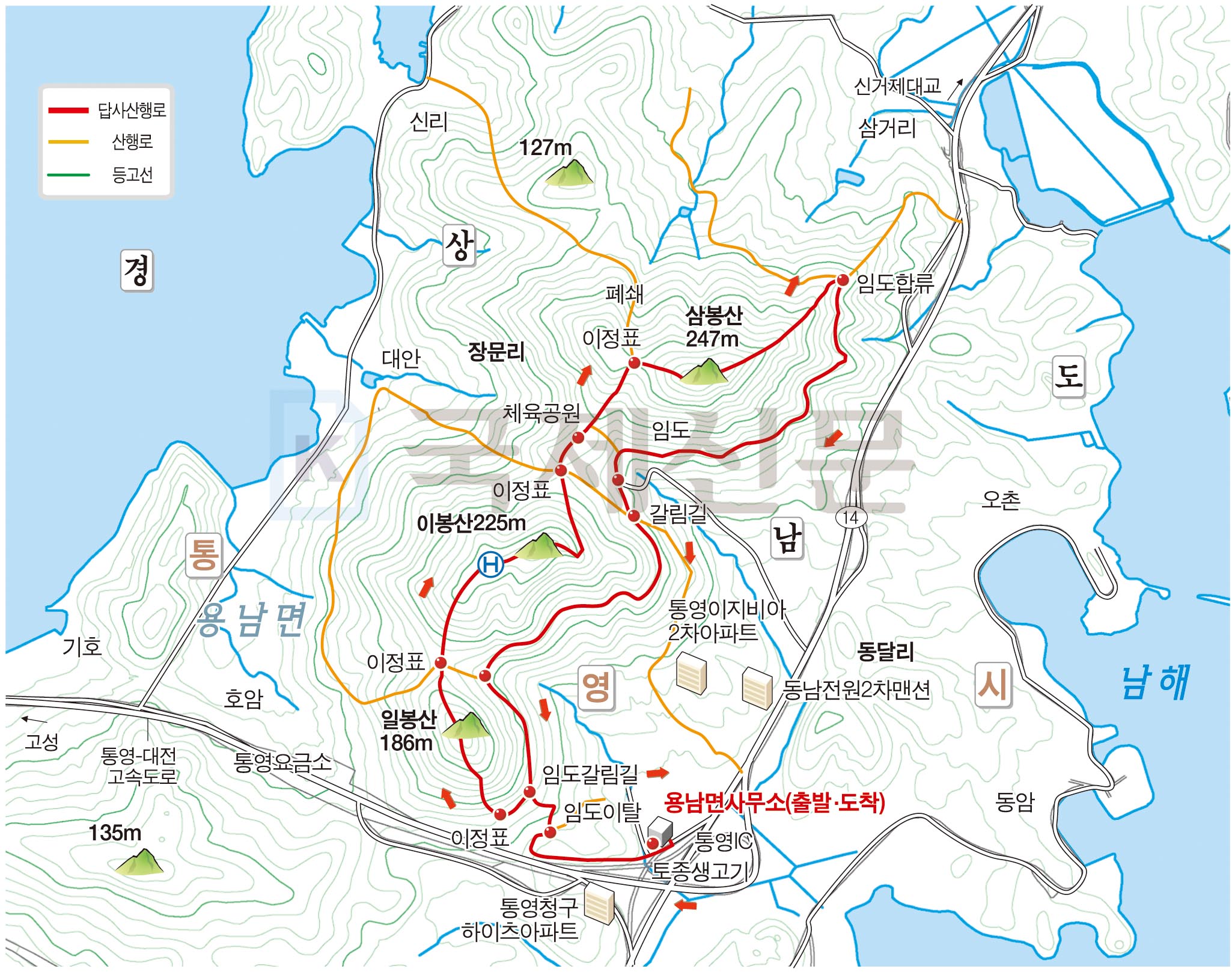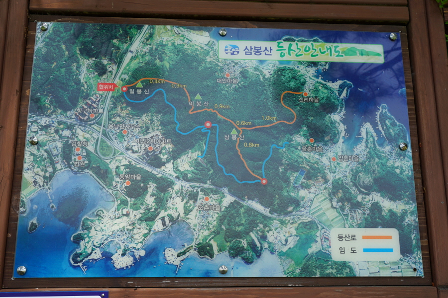 경남 통영시 삼봉산의 산행 경로를 보면 용남면사무소~