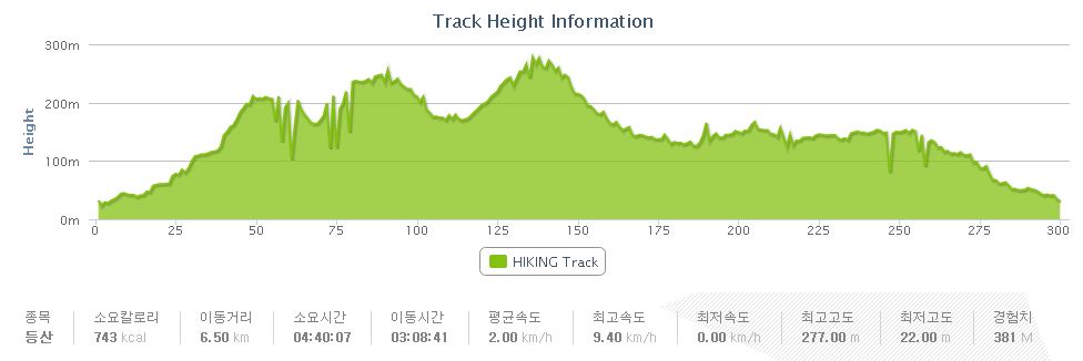 산행거리는 약 6㎞이며, 산행시간은 3시간 안팎이 걸립니다.