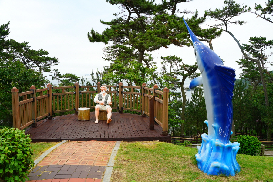 큰 물고기를 잡는 노인의 조형물이 있습니다.