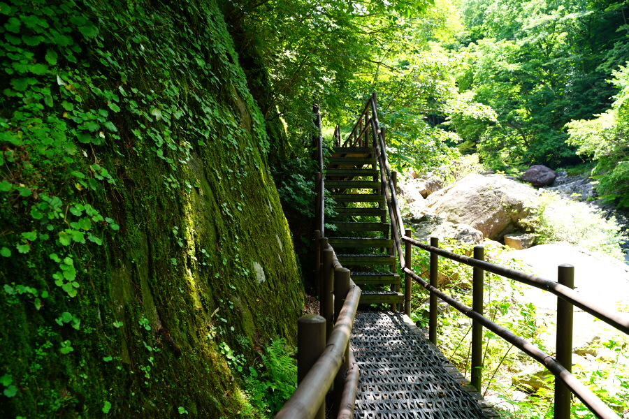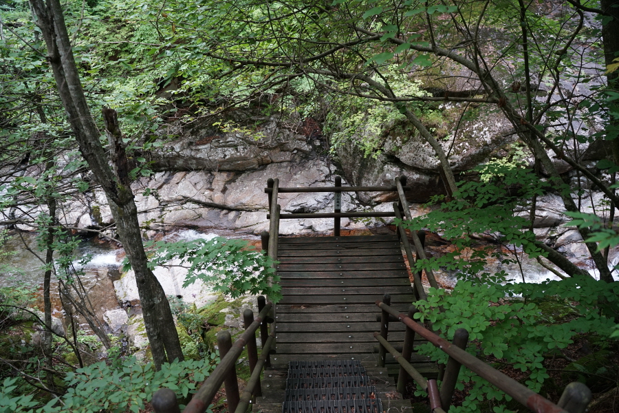 계곡을 가로지르는 나무계단,