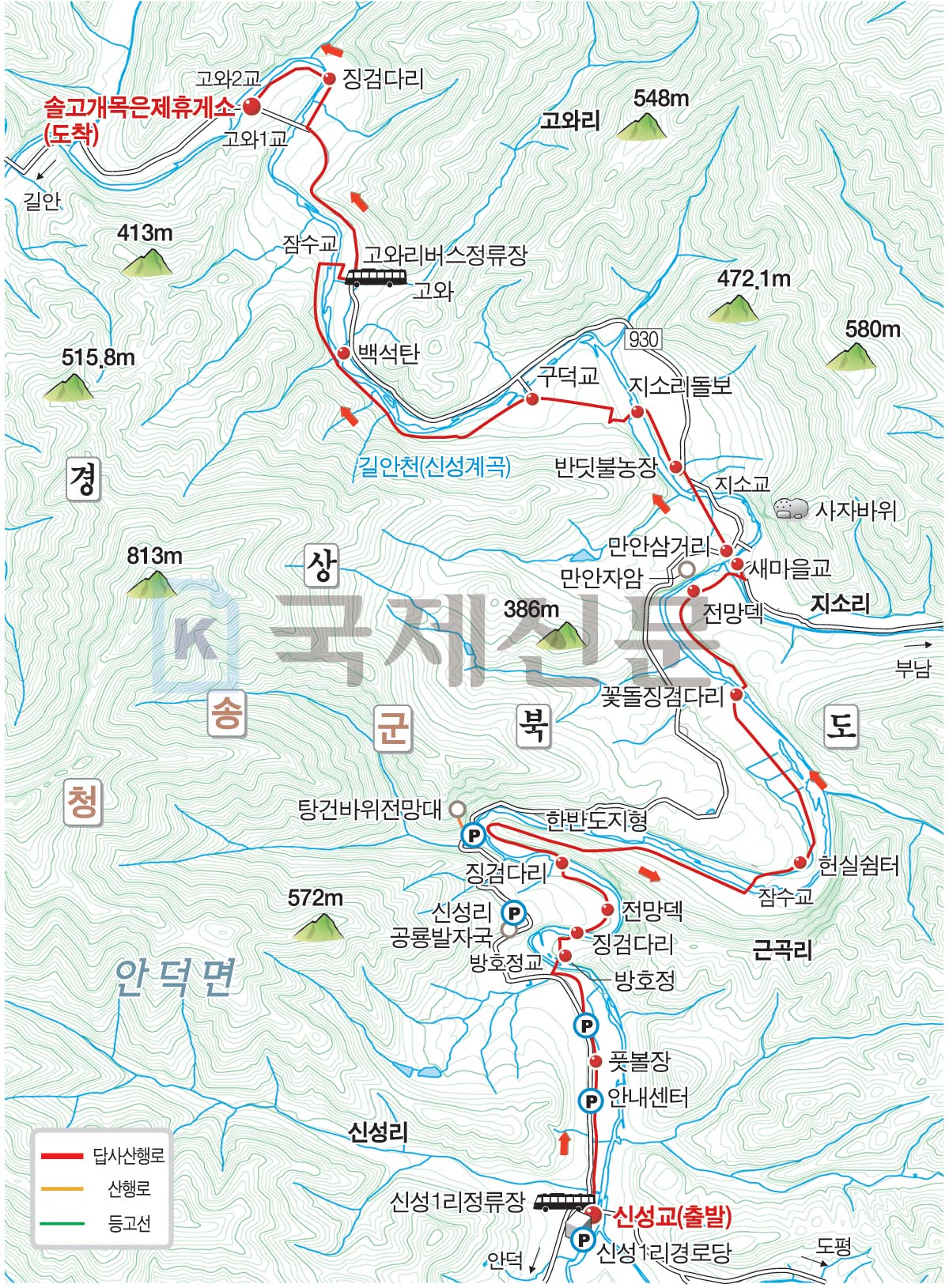 경북 청송군 안덕면 신성교 앞 신성계곡 녹색길 시점 입간판에서 출발~신성 학습관 안내 센터~방호정~징검다리~회양목 군락지 전망 덱~징검다리~ 한반도 지형~잠수교~헌실 쉼터~꽃돌 징검다리~만안자암 전망 덱~새마을교~만안삼거리~지소교~반딧불 농장~지소리 돌보~구덕교 앞 갈림길~백석탄~잠수교~고와리 버스 정류장~고와 1교 앞 갈림길~징검다리~녹색길 기종점 입간판~솔고개 목은제 휴게소에 도착합니다. 신성계곡 녹색길 거리는 11.8㎞이며, 4시간 30분 안팎이 걸립니다.