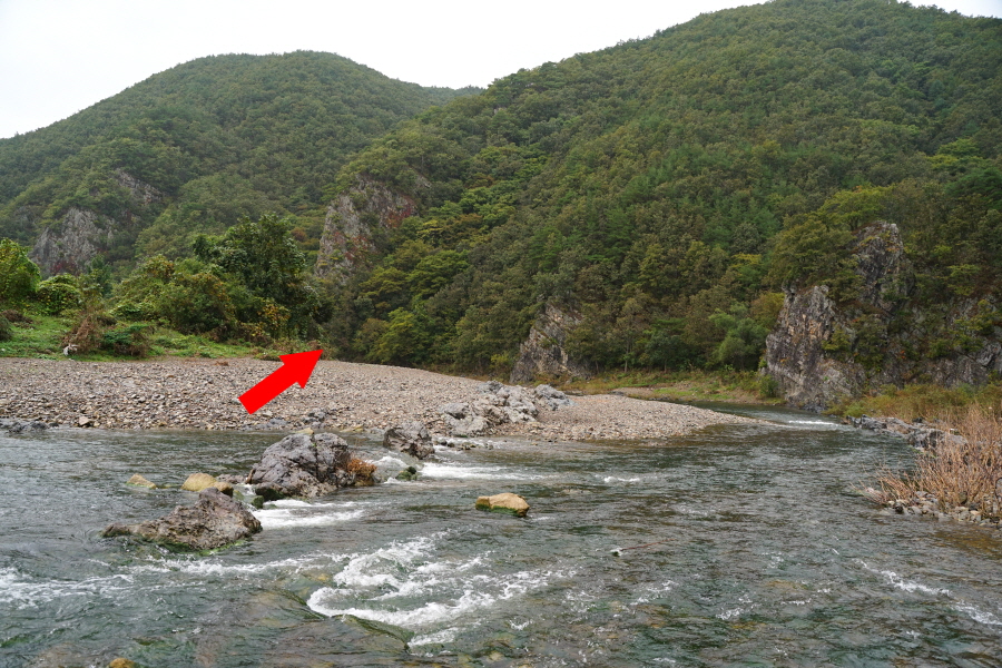 개울 건너 암벽을 자세히 보면 구멍이 뚫렸습니다.