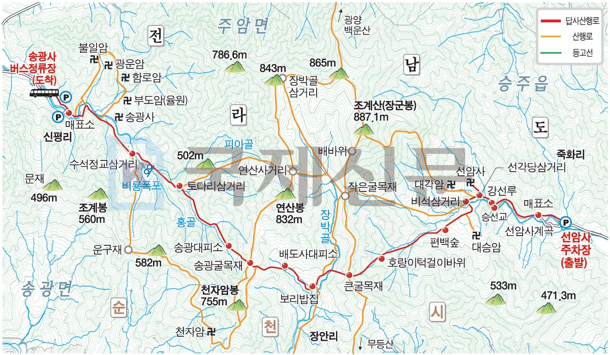 전남 순천시의 조계산(曹溪山·887.1m)은 영암 월출산(809.8m), 광주 무등산(1186.8m)과 함께 호남의 3대 명산으로 불리는데다 도립공원에 지정됐을 만큼 수려한 산세를 자랑합니다. 산의 동쪽에는 전통사찰의 옛 모습을 그대로 간직해 유네스코 세계문화유산에 등재된 선암사가 있다면 서쪽에는 보조국사 지눌이 수선사를 세워 승풍을 정화하는 정혜결사를 펼치면서 16명의 국사를 배출해 승보사찰로 불리는 송광사가 있습니다. 두 절과 주위를 묶어 명승 제65호에 지정됐을 만큼 수림이 울창해 특히 봄가을에는 더욱 많은 등산객이 두 절을 찾는 산행을 합니다. 필자는 선암사와 송광사를 휘감은 붉고 노란 단풍에다 두 절을 연결하는 지름길인 남도 삼백리 9코스 '천년 불심길'을 찾았습니다. 조계산은 명산에다 두 곳의 대 사찰까지 있어 다양한 등산로가 개설됐습니다. 선암사에서 장군봉 연산봉 송광굴목재 큰굴목재를 돌아 원점회귀하거나 송광사에서 피아골 장군봉 작은굴목재 큰굴목재 송광굴목재로 원점 회귀하는 산행을 주로 합니다. 또한 선암사에서 장군봉 연산봉을 거쳐 송광사로 하산하는 횡단 산행도 많이 이루어집니다. 그러나 가을 단풍 산행을 즐기기에는 천년 불심길이 조계산에서는 가장 인기를 끕니다. 이는 두 절집 사이에 완만한 큰굴목재와 송광굴목재를 오르내리는데다 조계산의 맛집으로 소문난 보리밥집이 있어 입맛과 산 맛까지 동시에 잡아 이를 두고 조계산 맛집 산행이라 합니다. 선암사는 승선교 삼층석탑 선암매 뒷깐(화장실) 등과 송광사는 국보로 지정된 목조삼존불 국사전 보물인 약사전 등 다수의 문화재가 남아 있습니다. 이번 코스에서는 제외되었지만 취재팀은 송광사 옆 성보박물관 오른쪽 길을 올라 고승대덕의 부도인 율원(부도암)을 거쳐 감로사(원감국사비), 법정스님이 머물렀던 불임암을 잇는 무소유 길도 함께 걸었습니다. 불일암은 오후 4시까지만 참배가 가능합니다. 참고하세요.