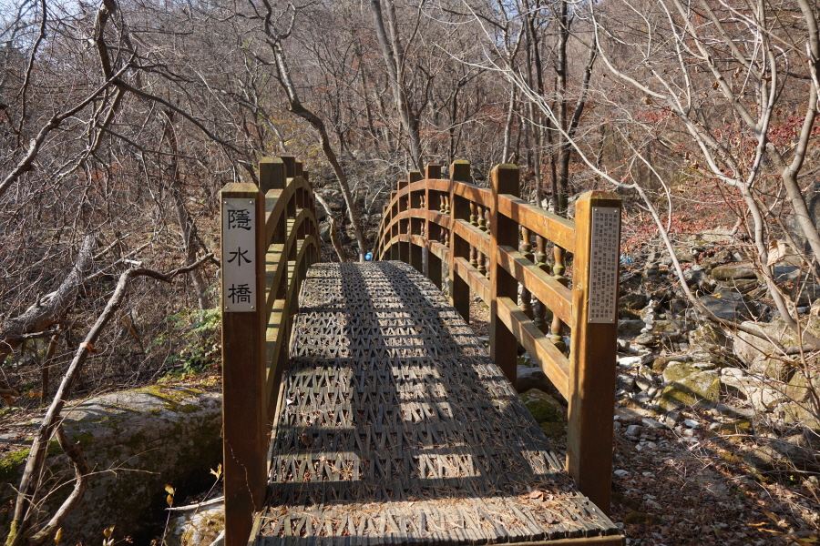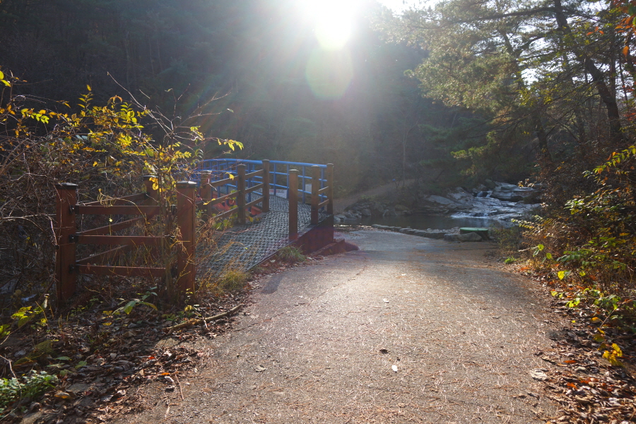 진불암을 나와 산비탈을 돌아 계곡에 놓인 목교를 건너