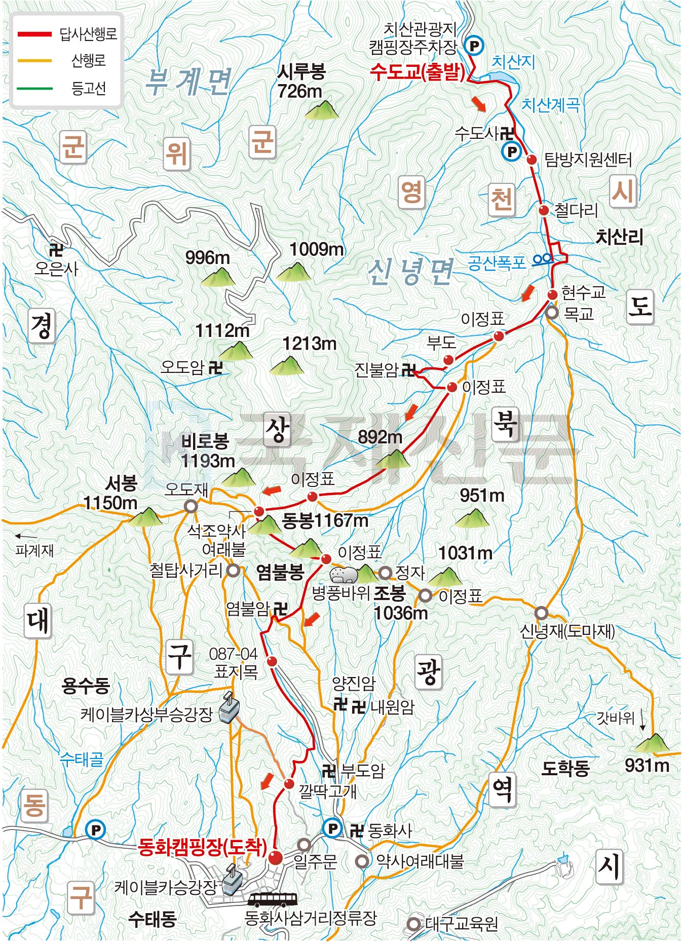 산행 뒤 동화사삼거리 정류장에서 동대구역 방향으로 출발하는 급행 1번 버스를 탄 뒤 동대구역 지하도 1 정류장에서 내립니다. 밤 11시30분까지 13분 간격으로 다닌다. 동대구역에서 부산행 기차는 수시로 있습니다. 승용차 이용 때에는 경북 영천시 신녕면 치산관광길 404 수도사를 내비게이션 목적지 한 뒤 수도사 주차장이나 치산관광지캠핑장 주차장에 주차하면 됩니다.