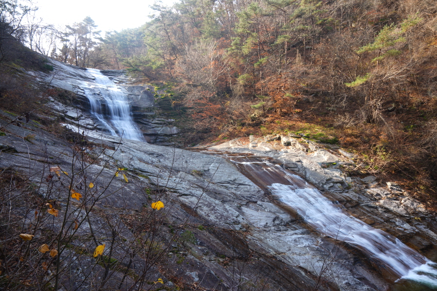 60m 길이에 3단으로 꺾이며 흐르는 폭포 앞에