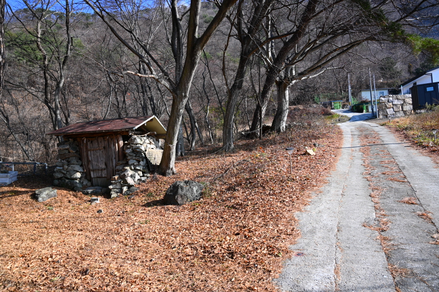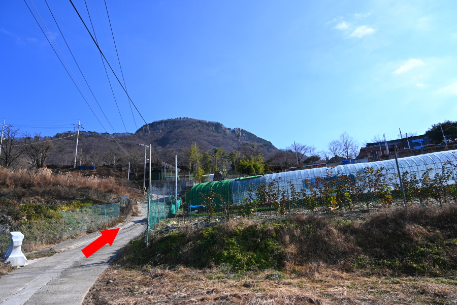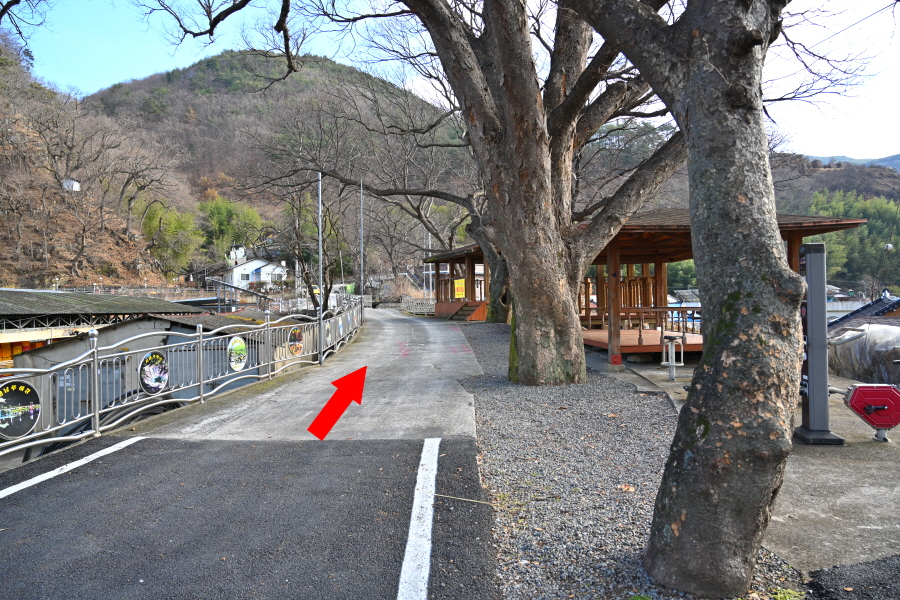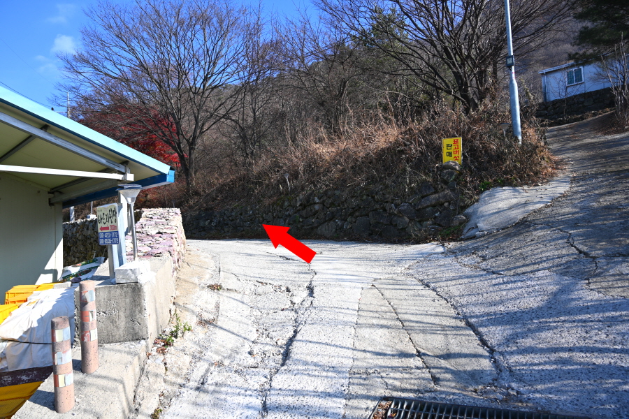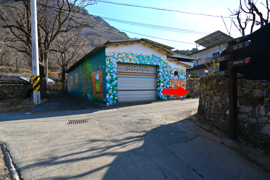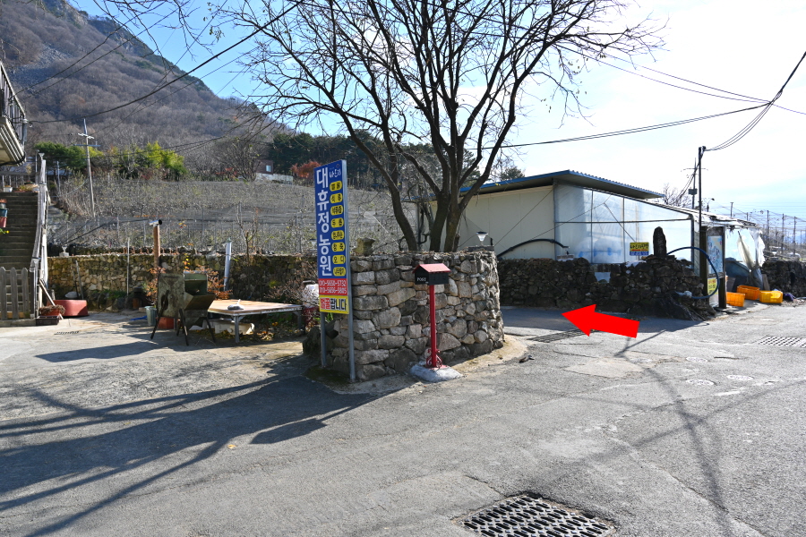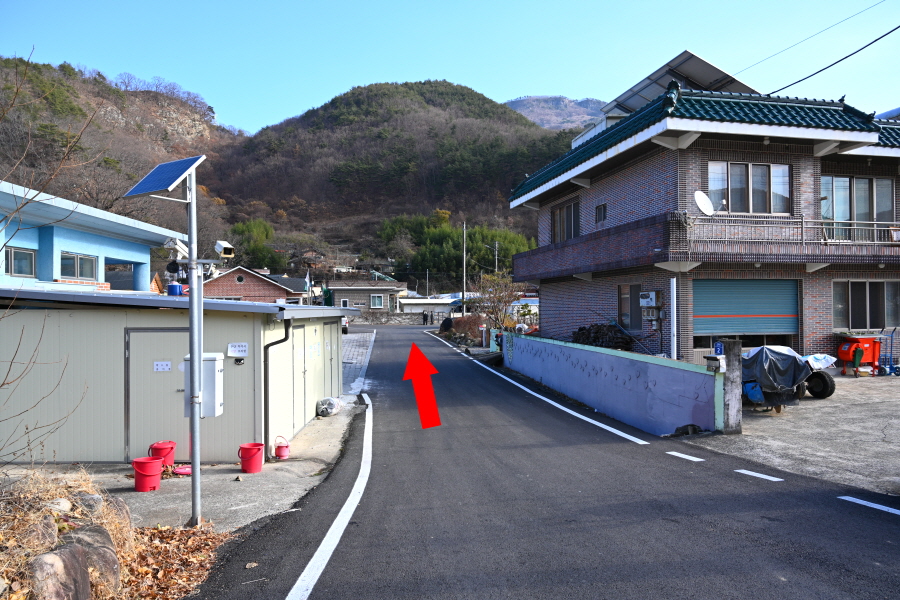 회관 앞 T자 갈림길에서 왼쪽으로 꺾습니다.