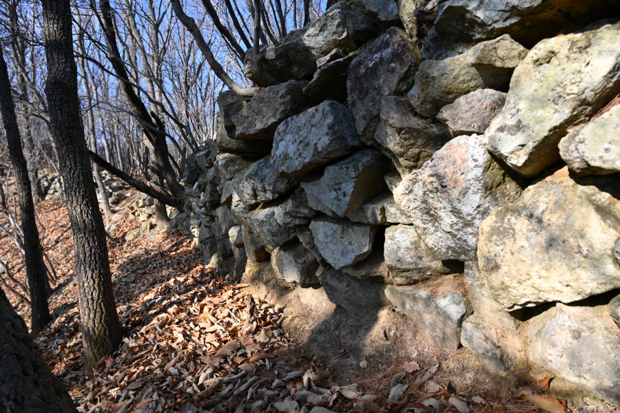 무너진 산성에 안내판이 서 있는데 필자는