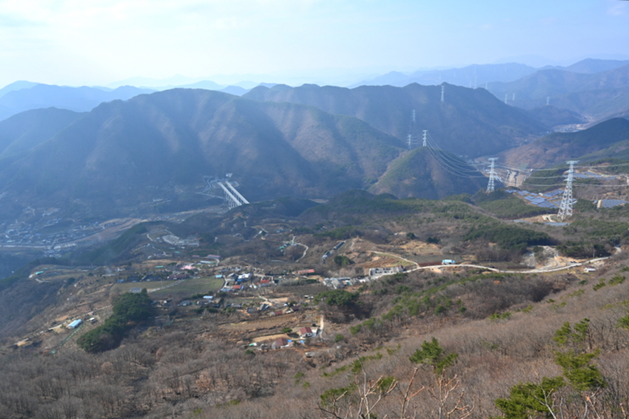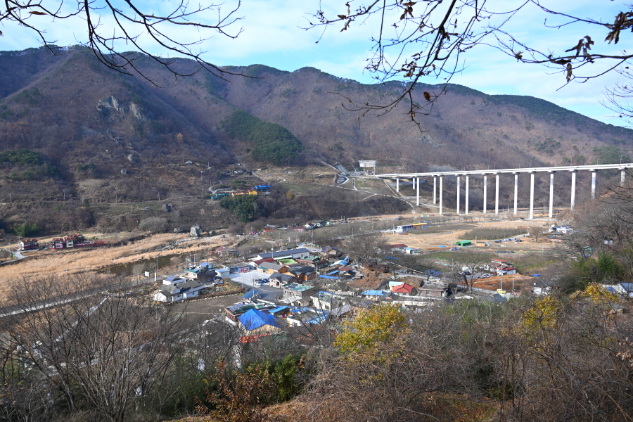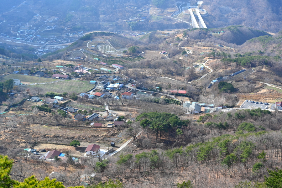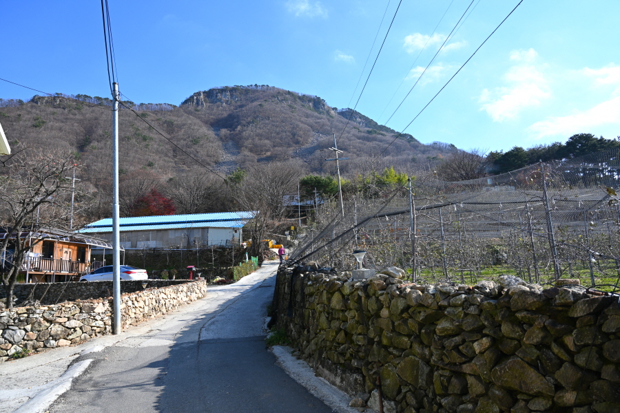 정면 마을 뒤로 백마산 정상이 우뚝합니다.