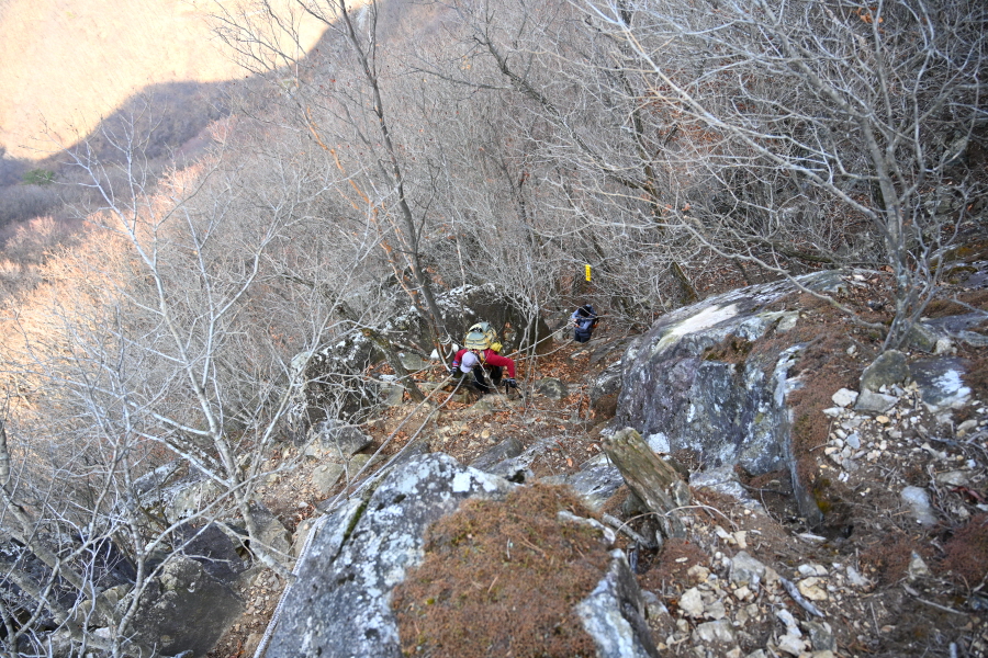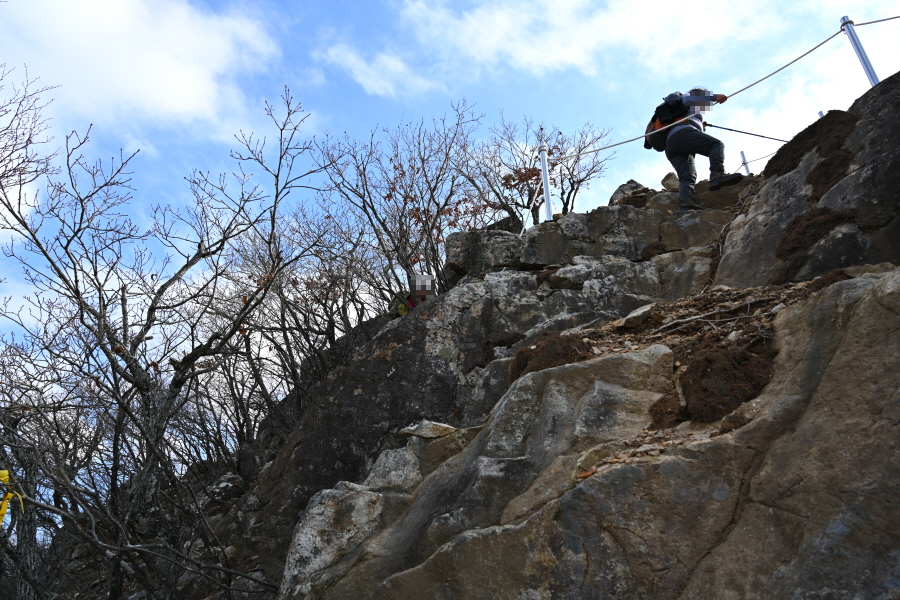 가파른 바위에 묶인 로프를 잡고 오르면