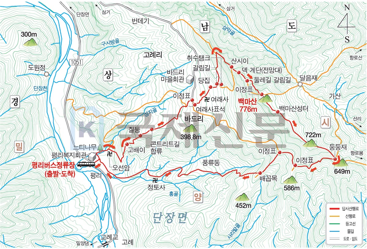 경남 밀양시 단장면 평리버스정류장에서 출발해 평리복지회관~오서암~고배이~질등~바드리 마을(대휴정 농원)~여래사~당집~백마산 능선 산시이~덱계단~백마산 둘레길 갈림길~백마산 정상~백마산성(까치목·발치산 초소 갈림길)~722m 봉~둥둥재(임도)~풍류동·밀양댐 갈림길~배꼽목~풍류동~평리버스정류장으로 되돌아오는 원점회귀입니다. 산행 거리는 약 8㎞이며, 4시간 안팎이 걸립니다.