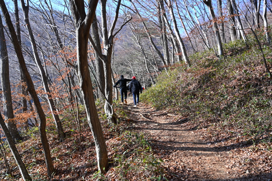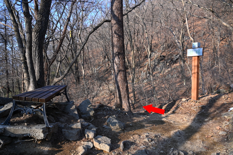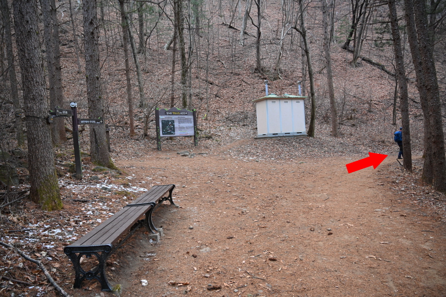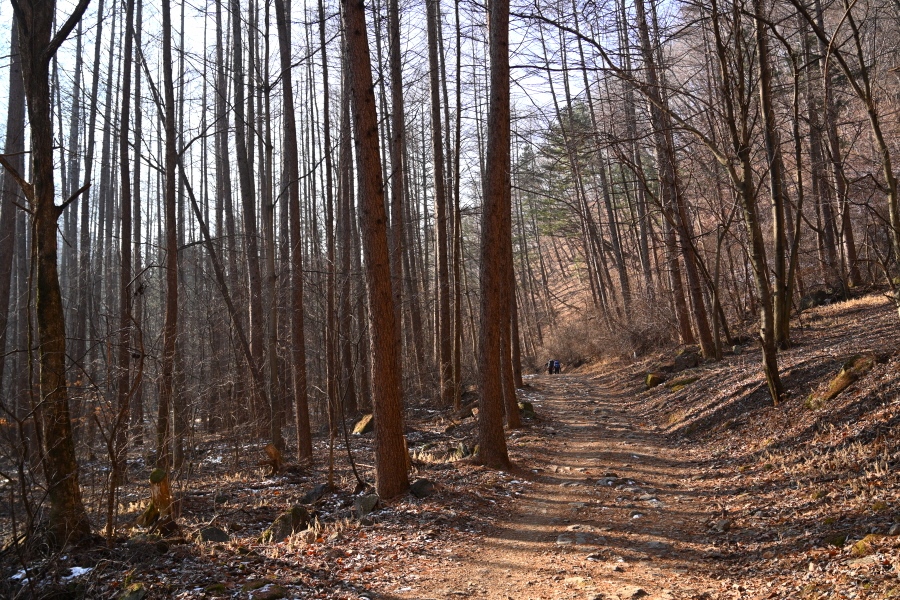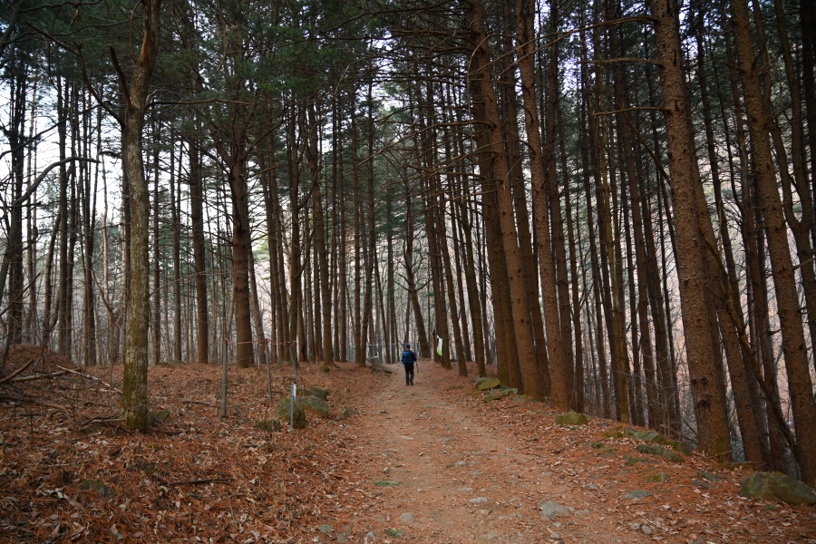 미나미골을 따라 무덤골과 벤치가 놓인 쉼터, 석기봉 갈림길를 차례로 지나 50분이면 잣나무 숲 삼거리에 도착합니다.