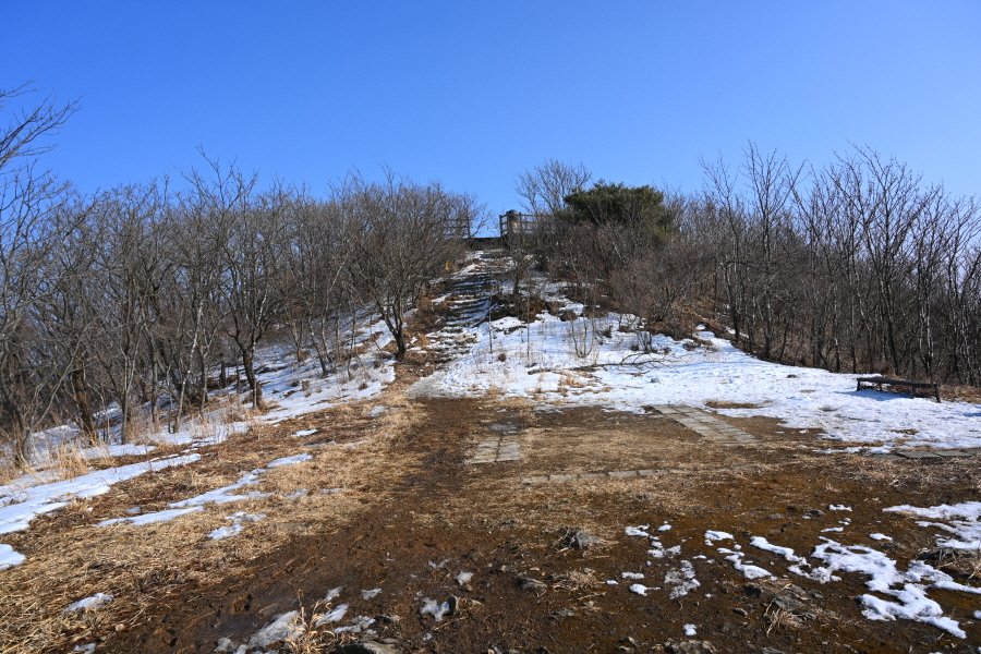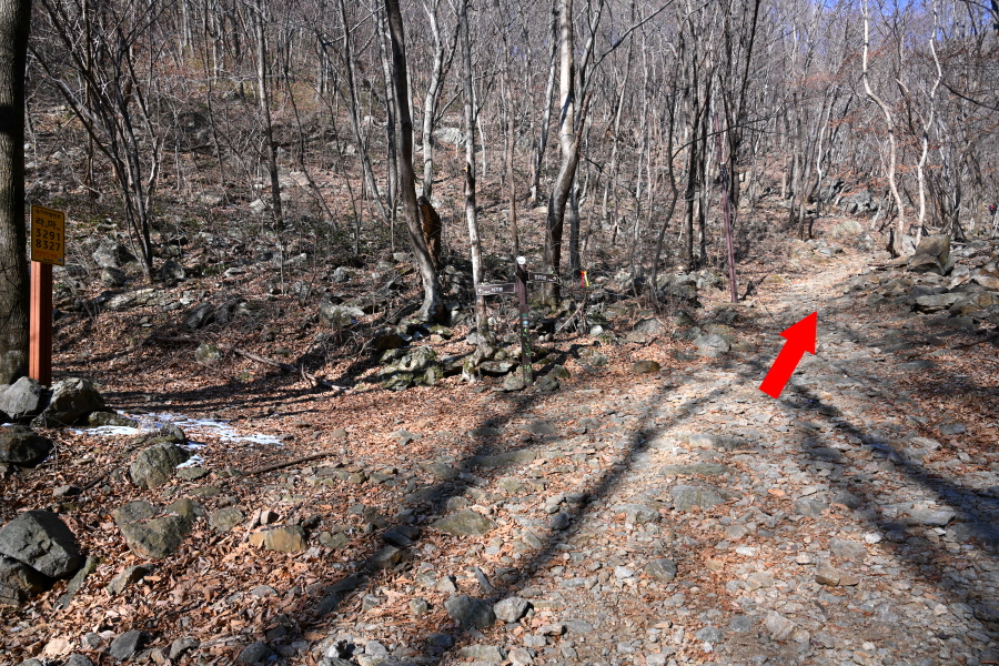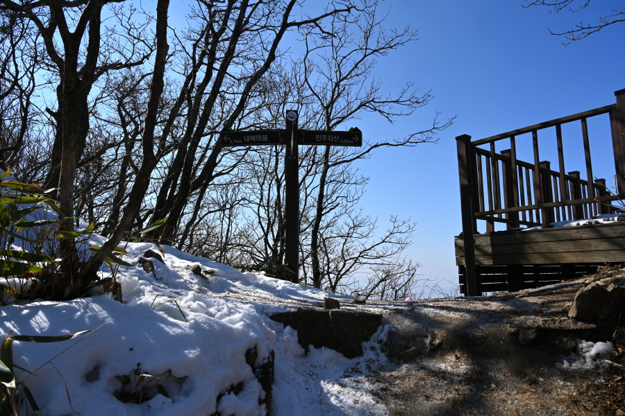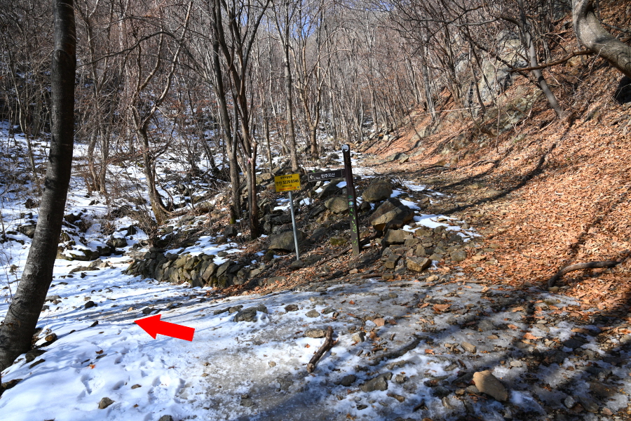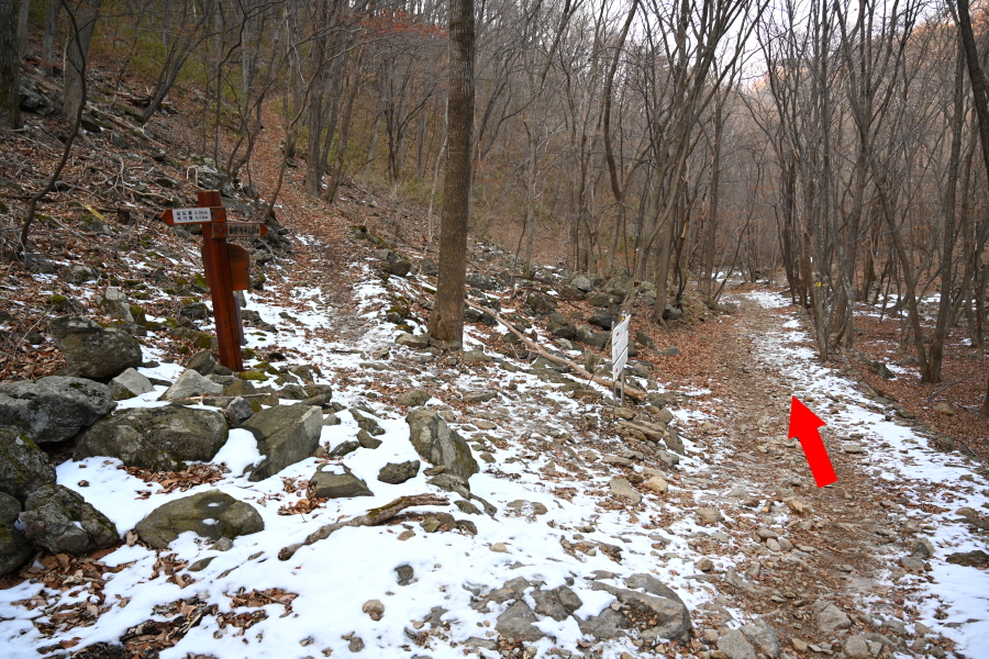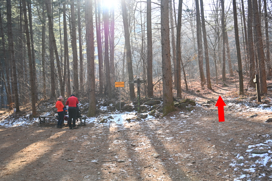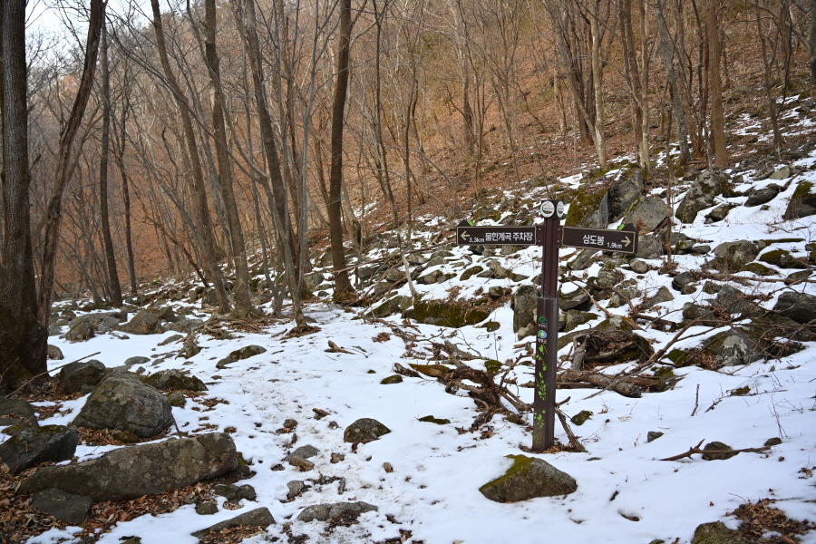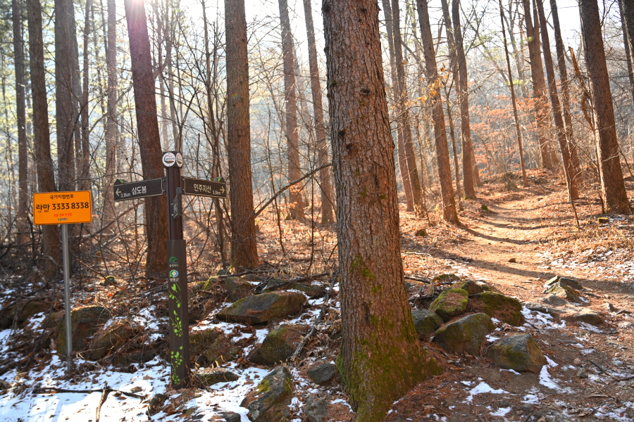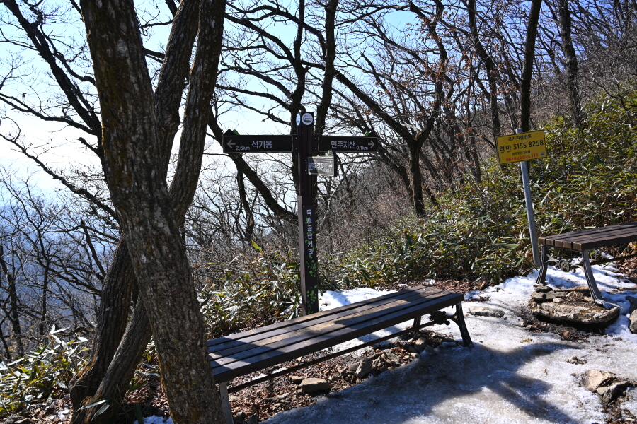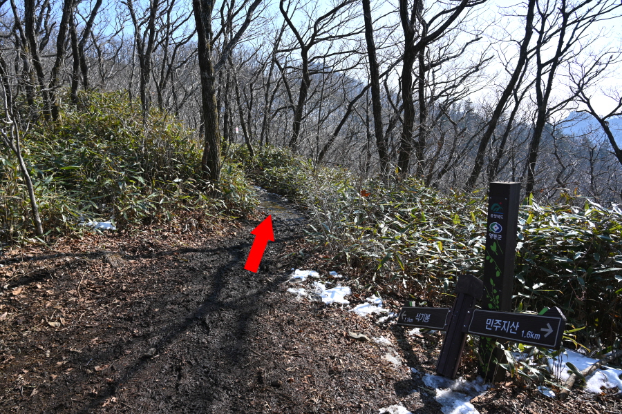 굽어 도는 산길에는 잔설이 남았습니다. 계곡 직전 갈림길에서 민주지산(1.7㎞)은 왼쪽으로 틀어 평탄한 길을 갑니다. 직진은 민주지산자연휴양림 방향.