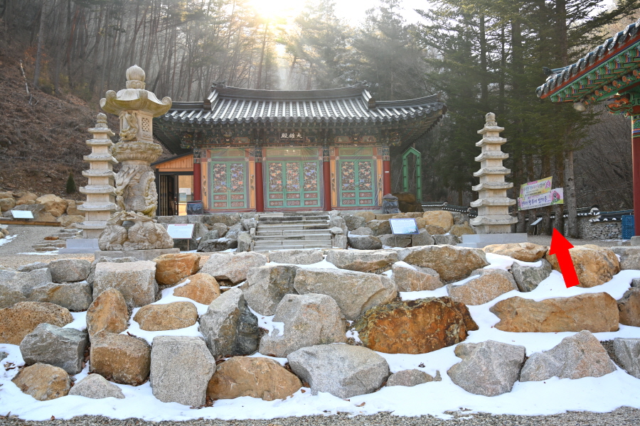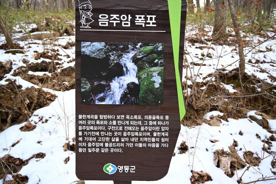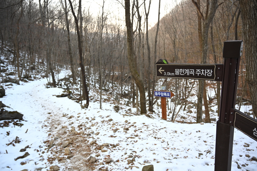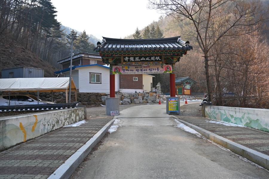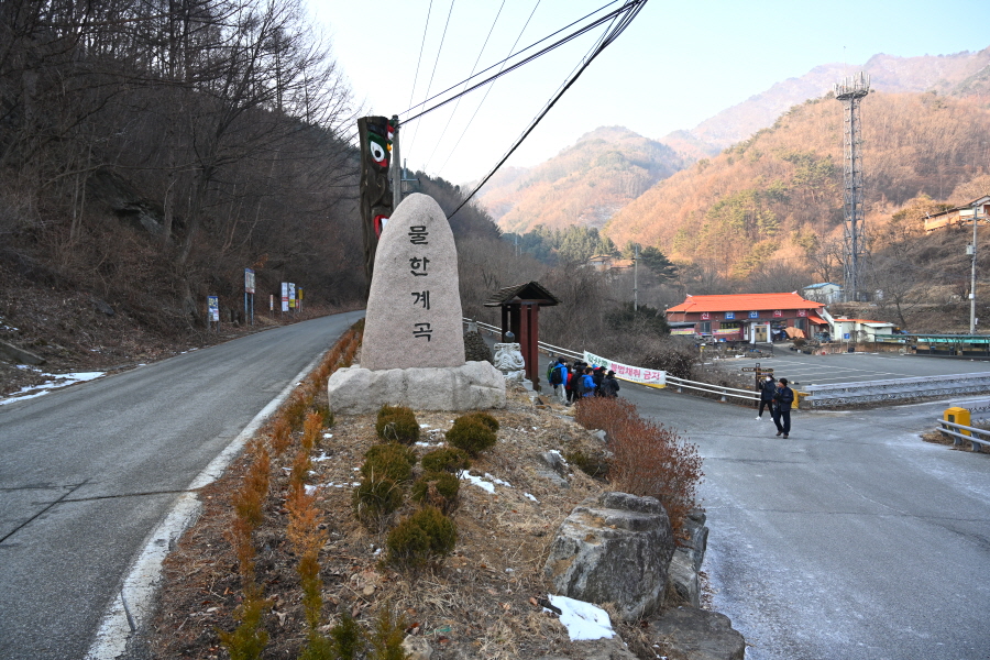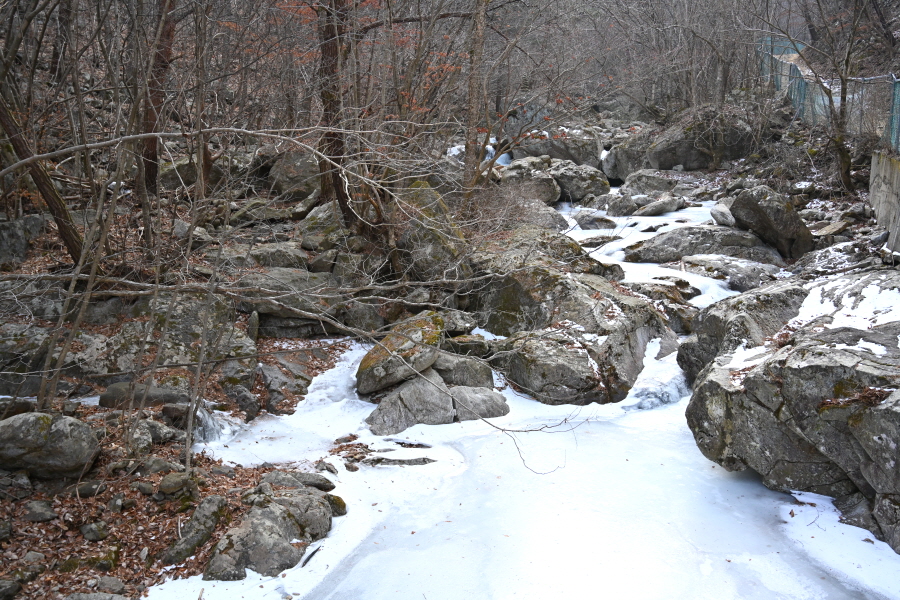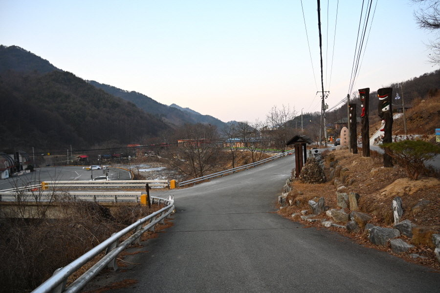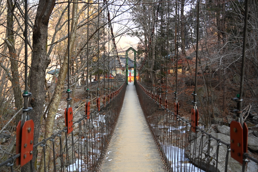 주차장에서 약 10분이면 황룡사에 도착해 대웅전을 오른쪽으로 돌아 출렁다리를 건너갑니다. 물한계곡은 꽁꽁 얼어붙어 겨울잠을 잡니다. 울타리가 쳐진 임도를 갑니다.