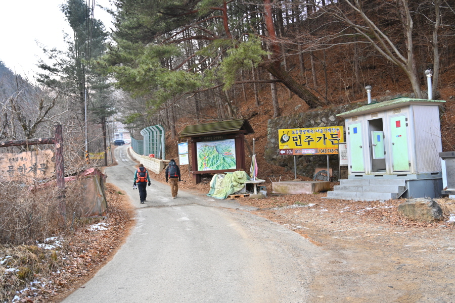 이번 산행은 물한계곡주차장에서 출발합니다. 물한교를 건너 민주지산 등산안내도 앞 삼거리에서 오른쪽 민주지산 방향 도로를 갑니다. 물한계곡 표석을 지나 화장실과 등산안내도 삼거리에서 민주지산은 직진 합니다. 오른쪽 철망문은 각호산 방향.