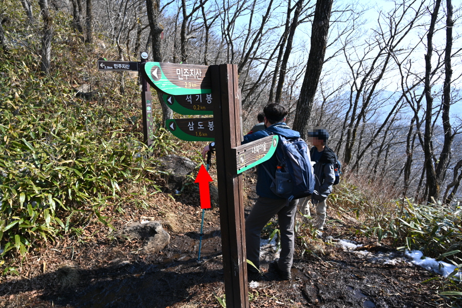 완만한 능선을 따라 석기봉에서 40분이면 백두대간이 지나가는 삼도봉에 도착합니다.