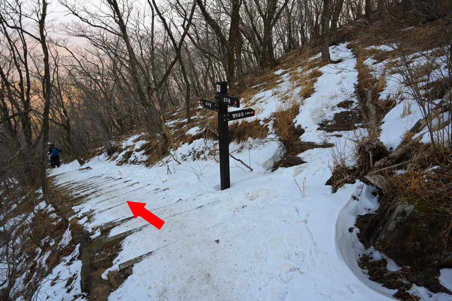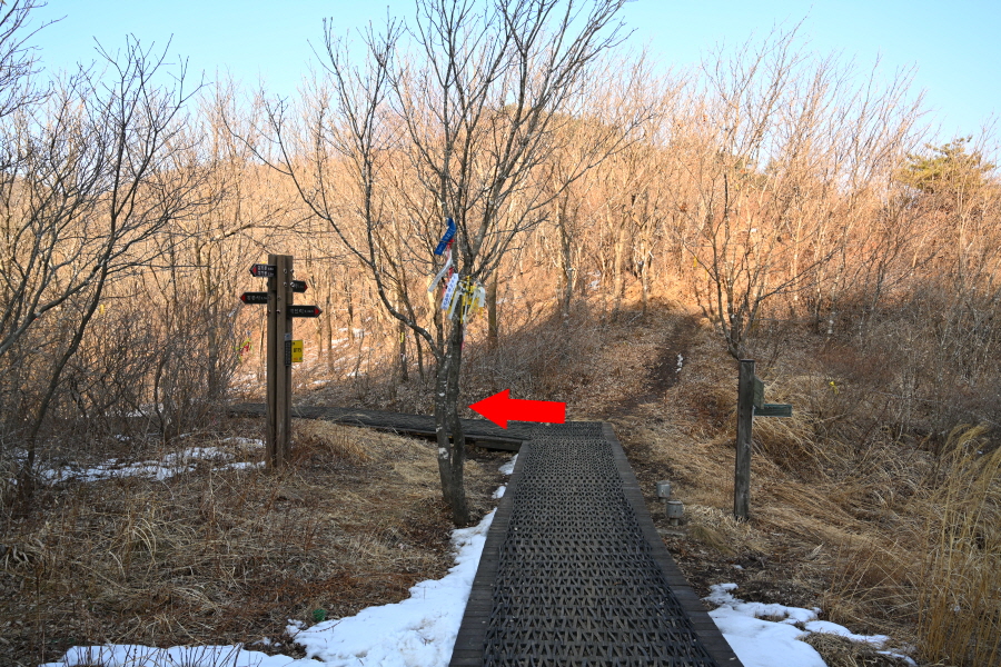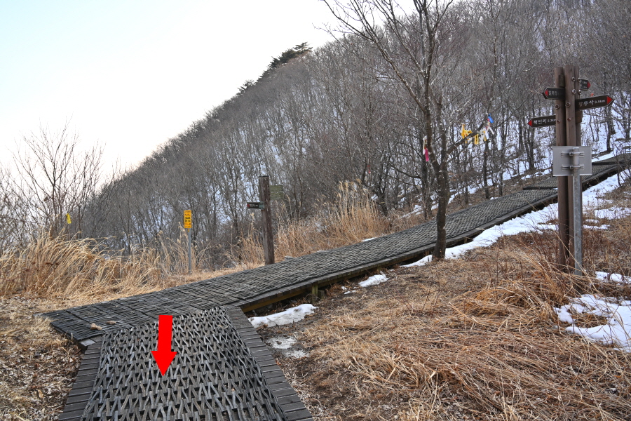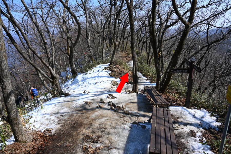 5분이면 물한계곡 주차장 갈림길 한 곳을 더 지납니다. 오르내리는 능선은 눈이 녹아 질퍽질퍽한 길이 이어집니다.
