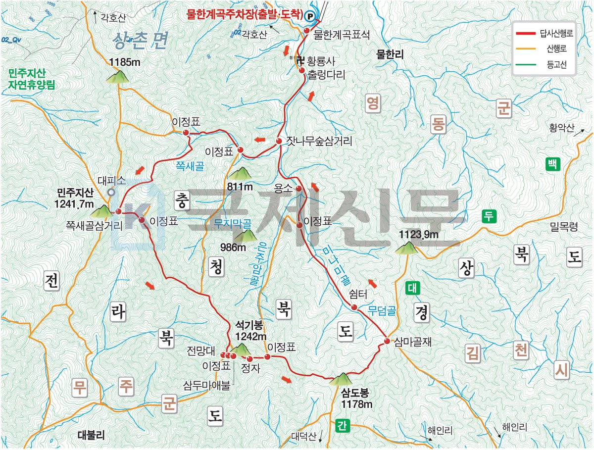 산행 경로는 영동군 상촌면 물한리 물한계곡주차장을 나와 물한계곡 표석 ~민주지산·각호산 갈림길~황룡사~제 1 삼거리(잣나무 숲)~민주지산·석기봉 갈림길~민주지산·민주지산자연휴양림 갈림길~쪽새골 삼거리~민주지산 정상~쪽새골 삼거리~석기봉·물한계곡주차장 갈림길~제 2 분기점~대불마을·석기봉 갈림길~석기봉 삼신상(삼두마애불)~석기봉 정상~정자 쉼터~제 3 분기점~삼도봉 정상~삼마골재~쉼터~제 2 삼거리~제 1 삼거리(잣나무 숲)에서 황룡사를 거쳐 물한계곡주차장으로 되돌아오는 원점회귀입니다. 산행거리는 약 14.3㎞이며, 5시간 30분 안팎이 걸립니다.