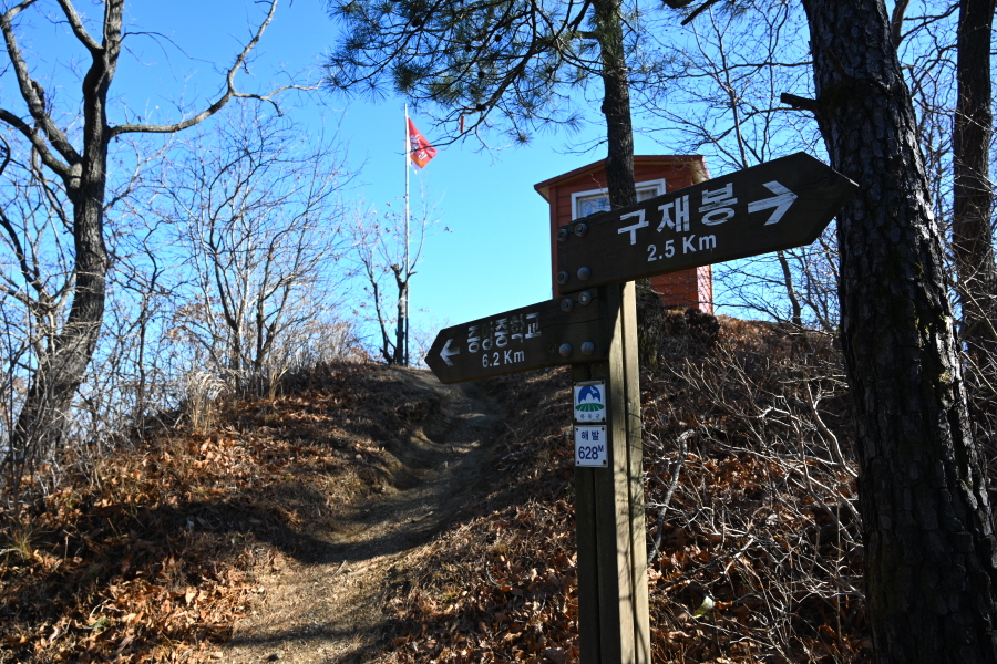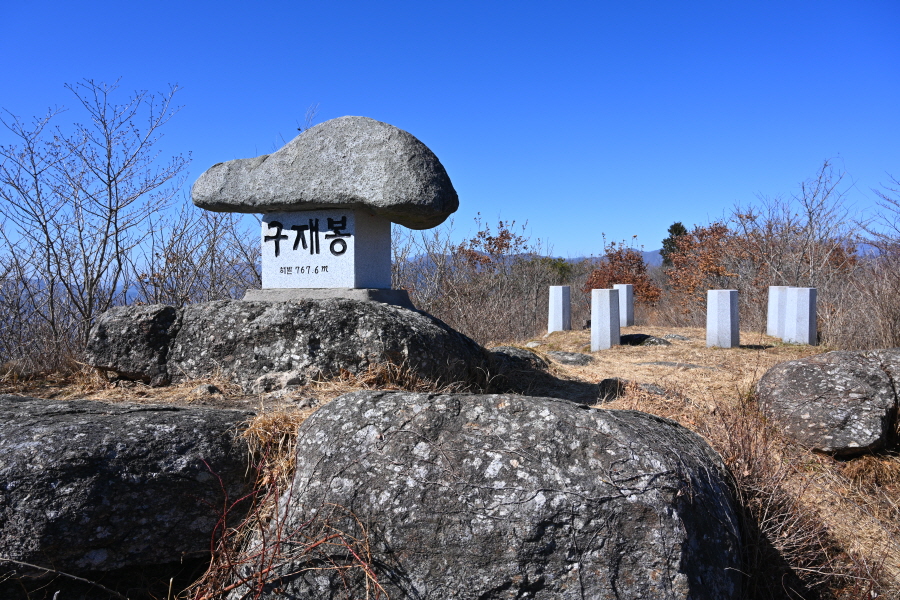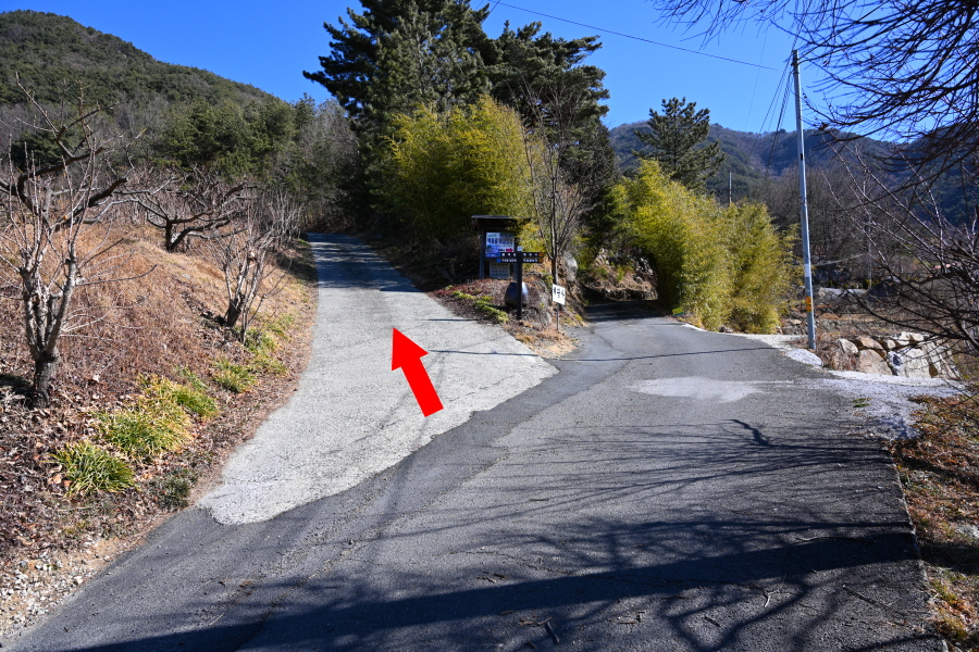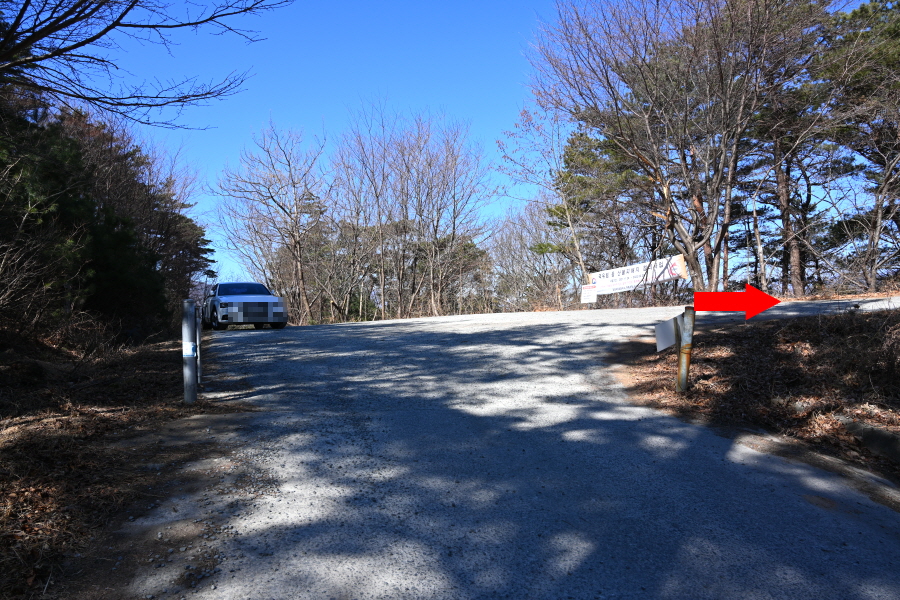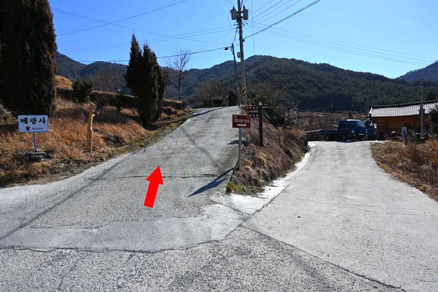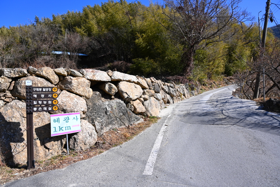 주차장을 나와 왼쪽으로 꺾어 도로를 갑니다. 먹점마을 작은 표석을 지나 차량 회차 지점에서 오른쪽 구재봉 활공장·혜광사 방향으로 콘크리트길을 갑니다. 지금부터 활공장 이정표를 따라갑니다.
