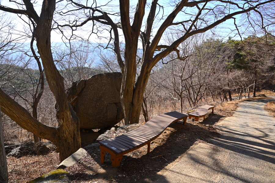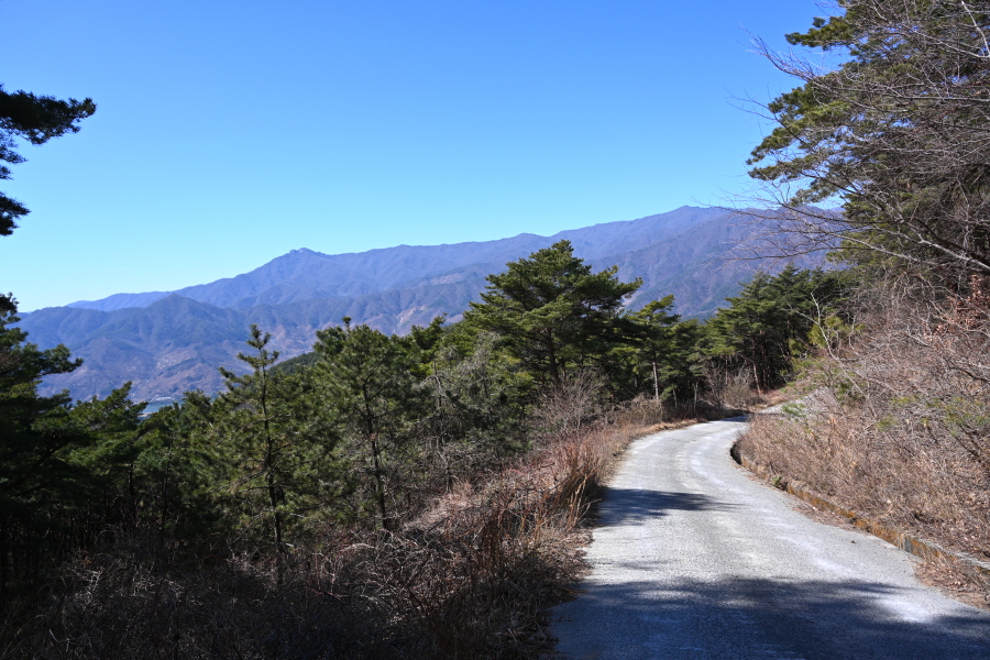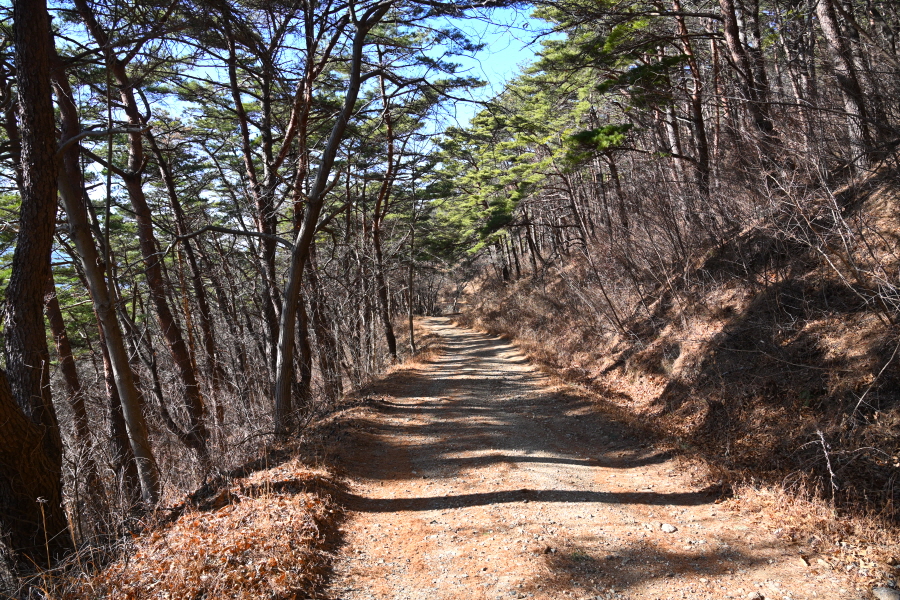 살짝 오르막길이 이어집니다. 왼쪽에 소설 ‘토지’의 무대인 악양들의 부부 소나무를 빼 닮은 먹점마을 부부 소나무가 눈길을 끕니다. 구불구불한 임도는 비포장 흙길로 바뀝니다. 주차장에서 30분이면 임도 삼거리인 먹점재에 도착합니다.