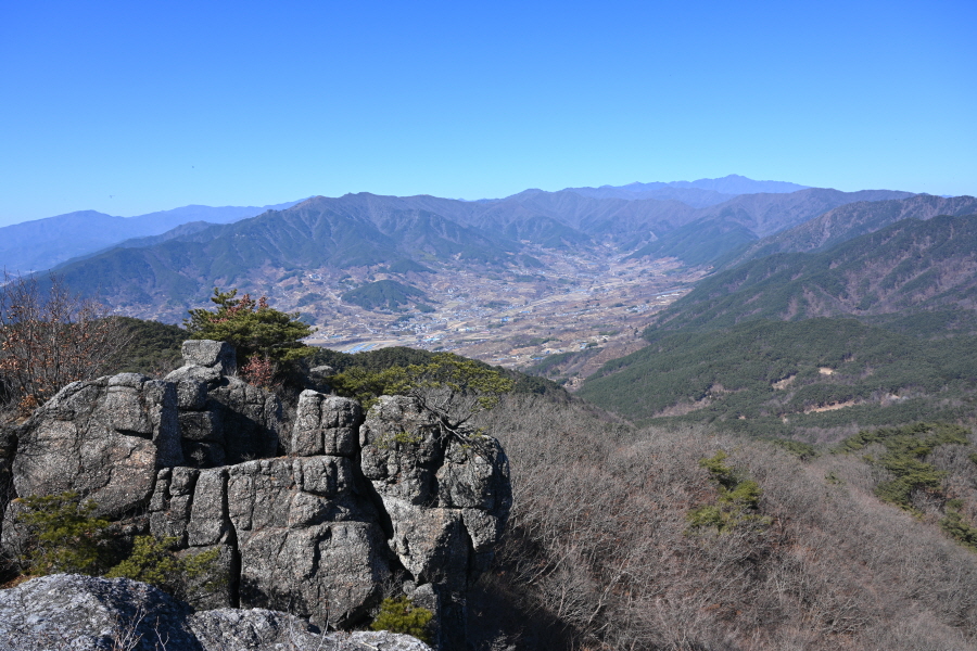 옥산과 이명산 멀리 와룡산이 펼쳐지며 발아래 골짜기는 구재봉자연휴양림입니다.