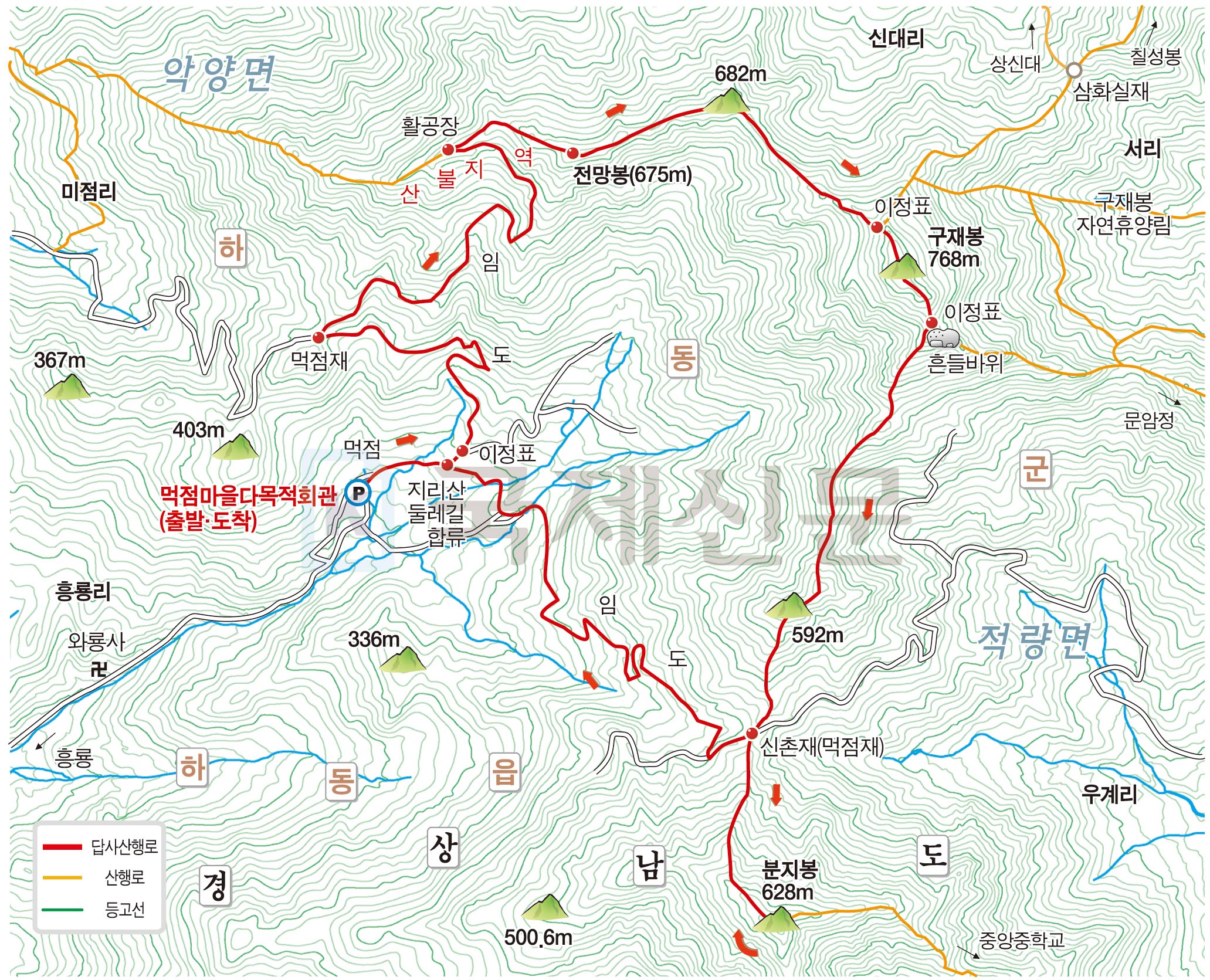 하동군 하동읍 흥룡리 먹점마을다목적회관~지리산둘레길 갈림길~먹점재~활공장~칠성봉·구재봉 갈림길~구재봉 정상~구재봉자연휴양림 갈림길~신촌재(먹점재)~분지봉~신촌재(먹점재)~서어나무 쉼터~지리산둘레길 갈림길~먹점마을다목적회관으로 되돌아오는 원점회귀입니다. 산행거리는 약 9.5㎞이며, 약 4시간 안팎이 걸립니다.