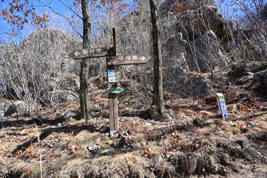 오른쪽 구재봉(150m) 정상으로 향합니다. 왼쪽은 칠성봉(6.2㎞) 방향. 깎아 세운 바위 벼랑인 상사바위 전망대를 지납니다.