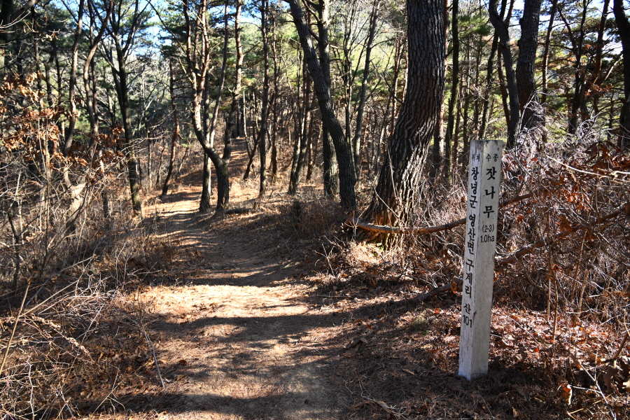 잣나무 식재 푯말을 지나 안부 갈림길에서 오른쪽으로 꺾어 양삼골로 내려갑니다. 직진은 구계임도 방향이며, 함박산 덕암산 화왕산으로 연결됩니다.