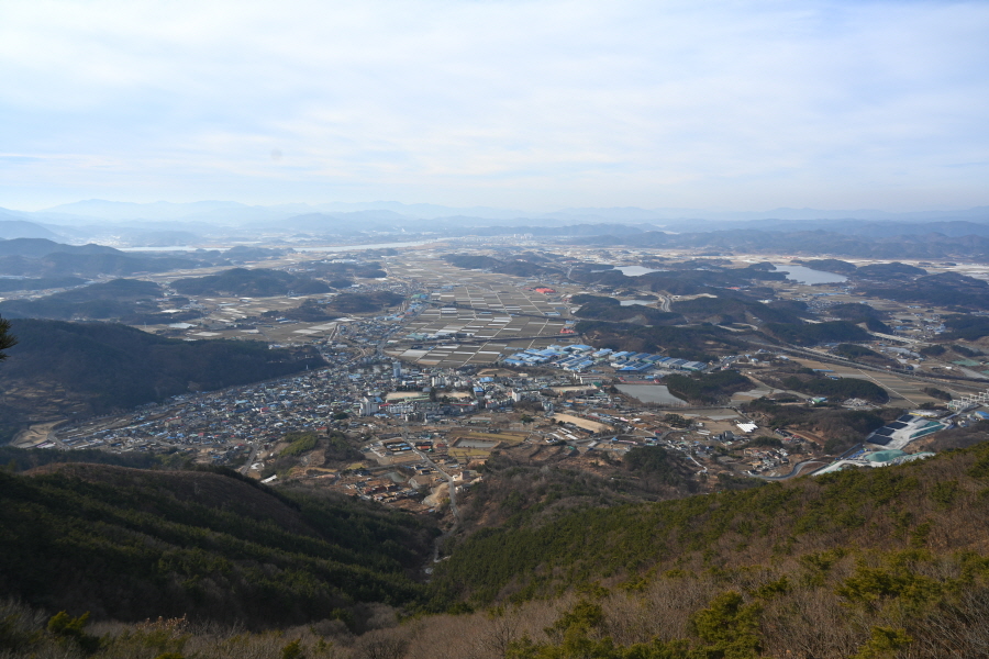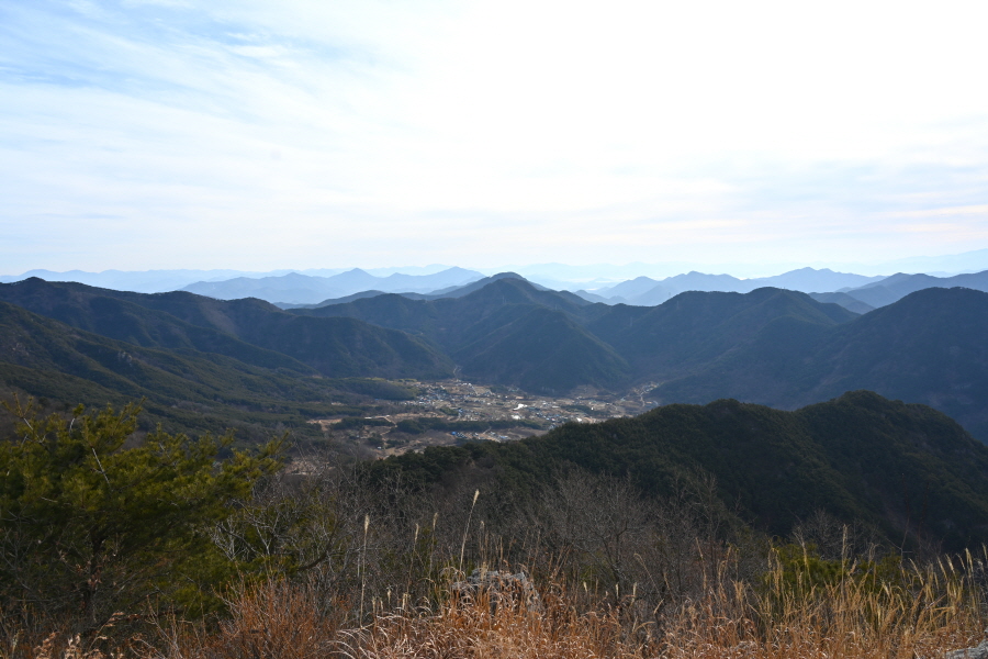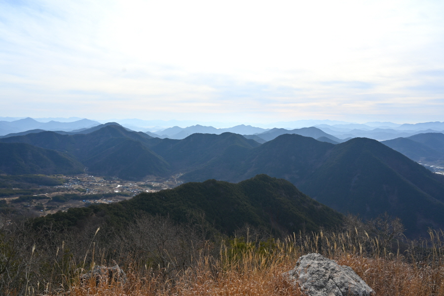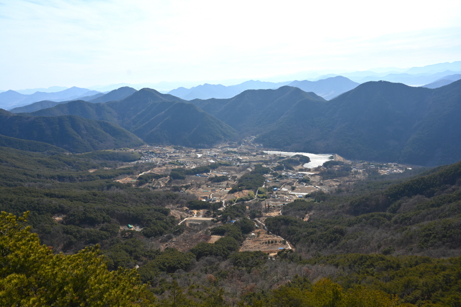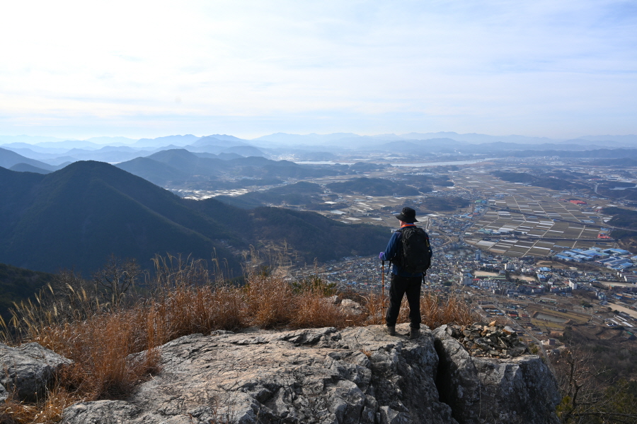남쪽 발아래 영산면 소재지와 함박산 뒤로 낙동강이 흘러갑니다. 영축산으로 향합니다.