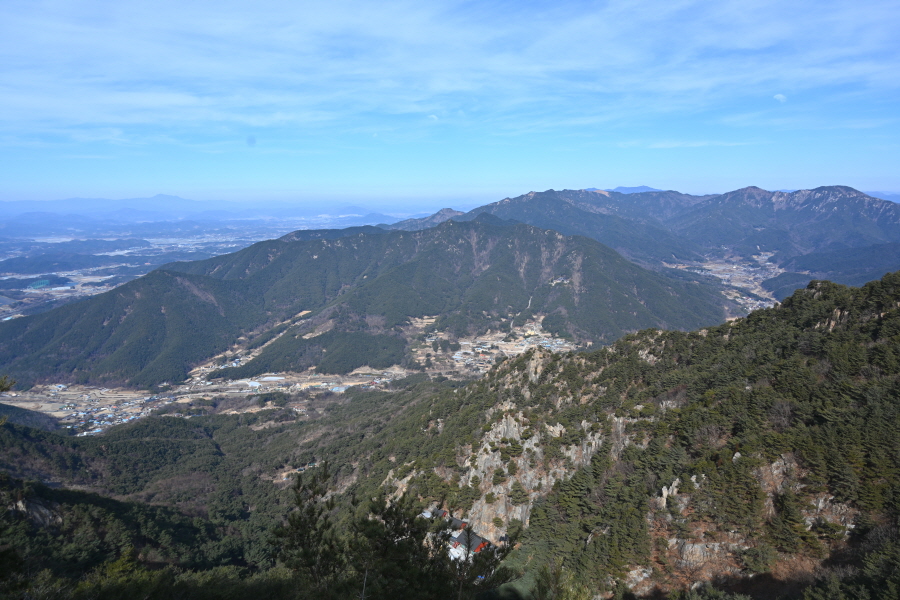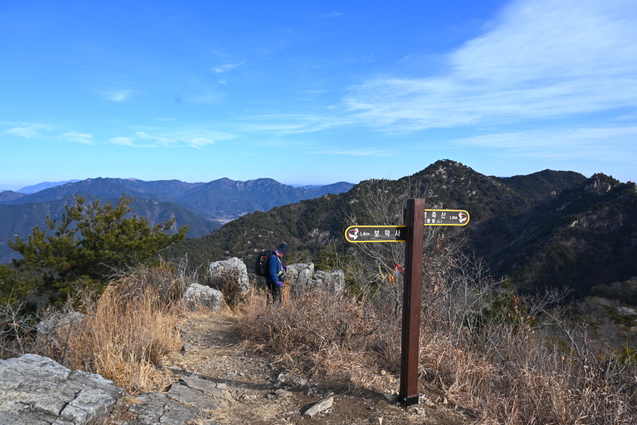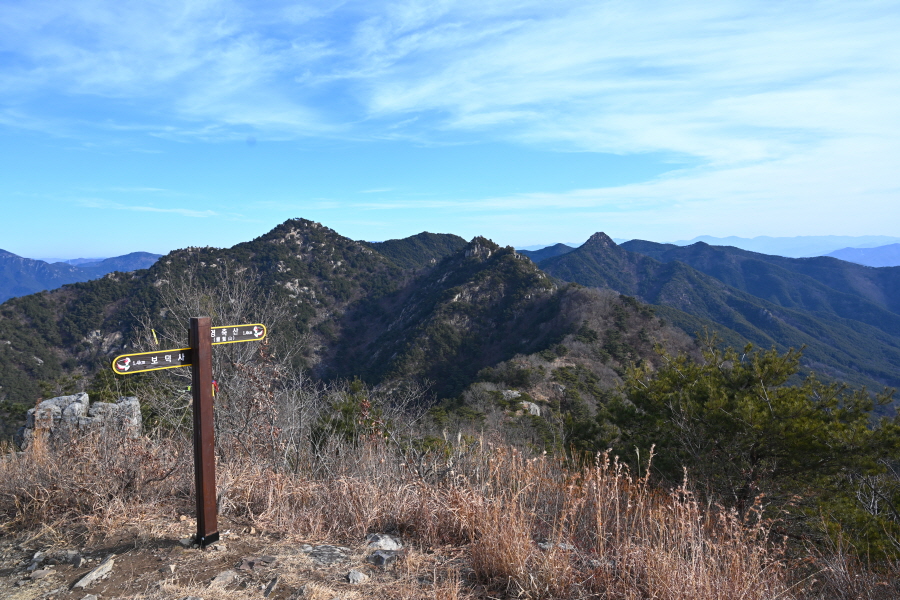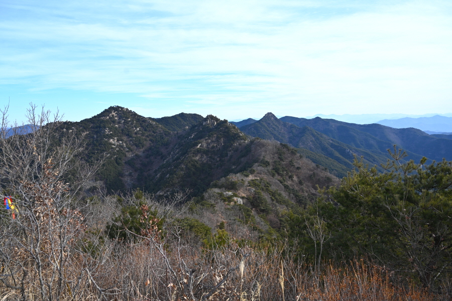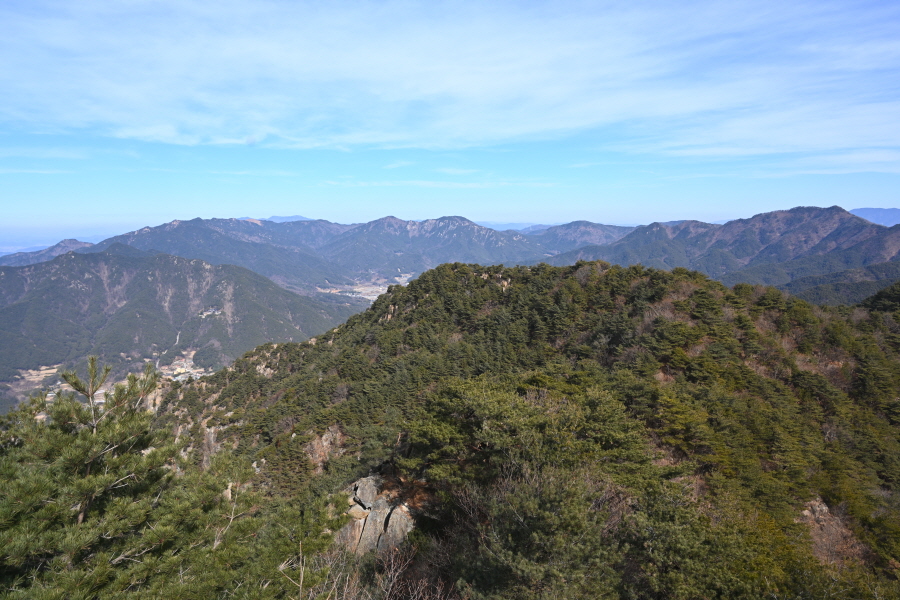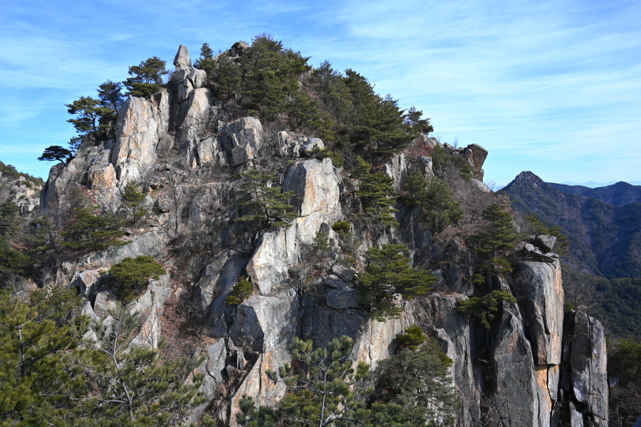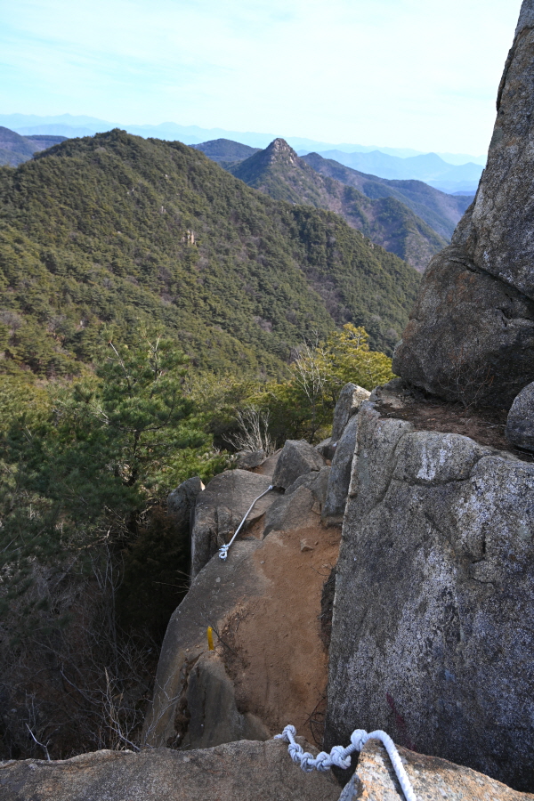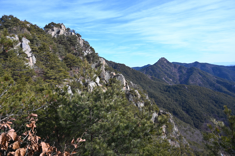 안전 시설물이 설치된 암릉을 넘어 변봉에 서면 조망이 열립니다.