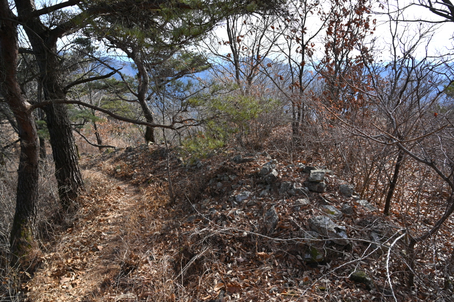 능선에 산성의 흔적인 돌무더기가 깔렸는데, 신라의 공격에 대비해 가야가 쌓은 영축산성입니다.