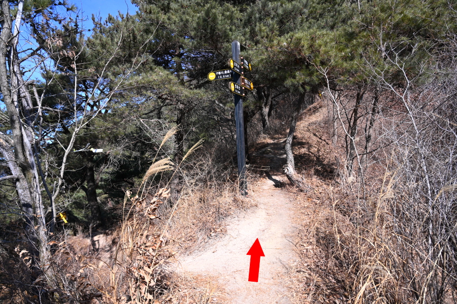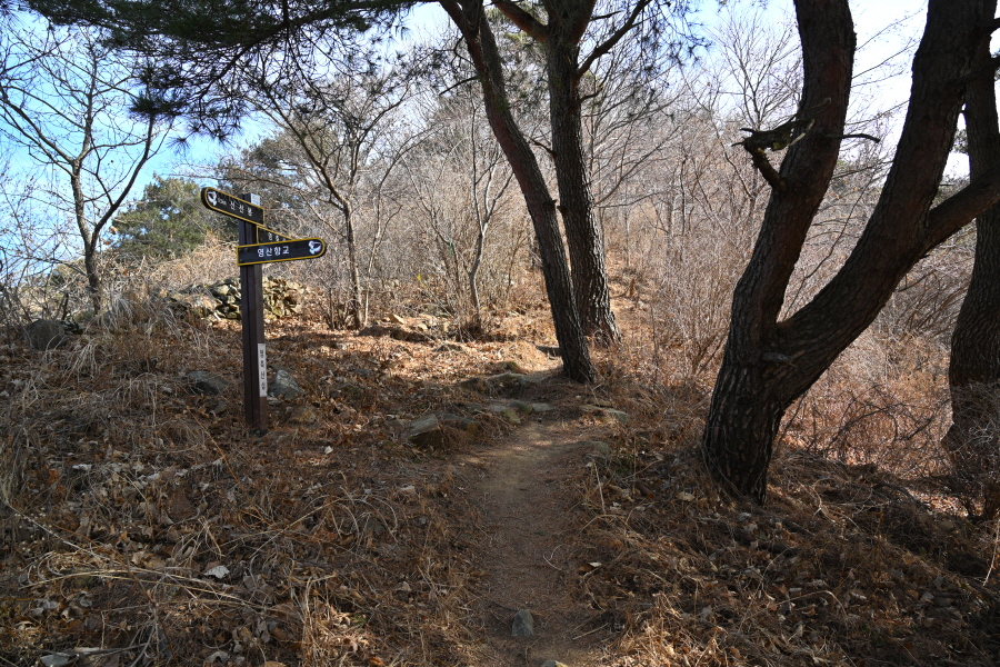 완만한 능선을 10분 즈음 가면 오른쪽 영산향교에서 올라오는 두 곳의 갈림길과 만나 직진합니다.