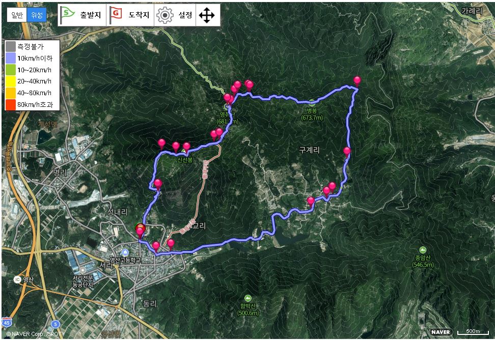 산행 경로는 창녕군 영산면 성내리 보덕사 입구 오거리~보덕사~신선봉~영산향교·영축산 갈림길~647m봉~변봉·영축산 갈림길~영축산 정상~변봉·영축산 갈림길~변봉 갈림길~변봉·충효사·구봉사 갈림길~변봉·사리 갈림길~변봉·청련사 갈림길~추모비~변봉(꼬깔봉) 정상~삼거리~양삼골~내촌마을~구계마을회관~두 곳의 구계저수지를 지나 성내리 오거리로 되돌아오는 원점회귀입니다. 산행거리는 약 11.5㎞이며, 5시간 안팎이 걸립니다.