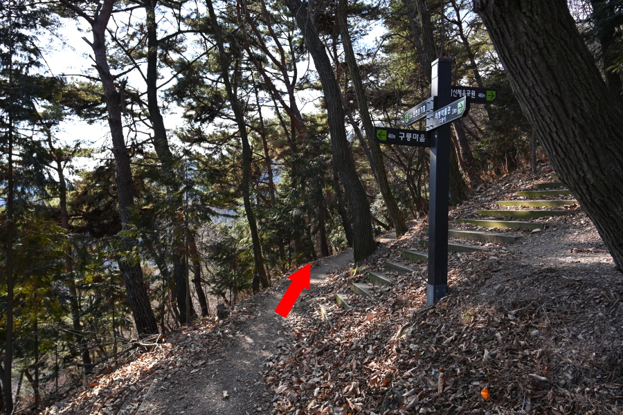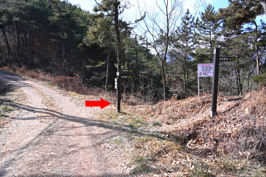 곧 서남 마을 갈림길에서 남산체력단련장으로 직진합니다.