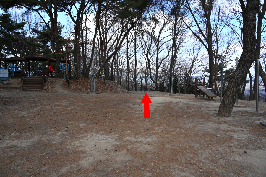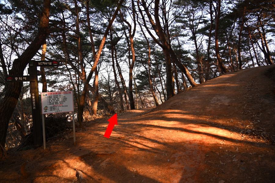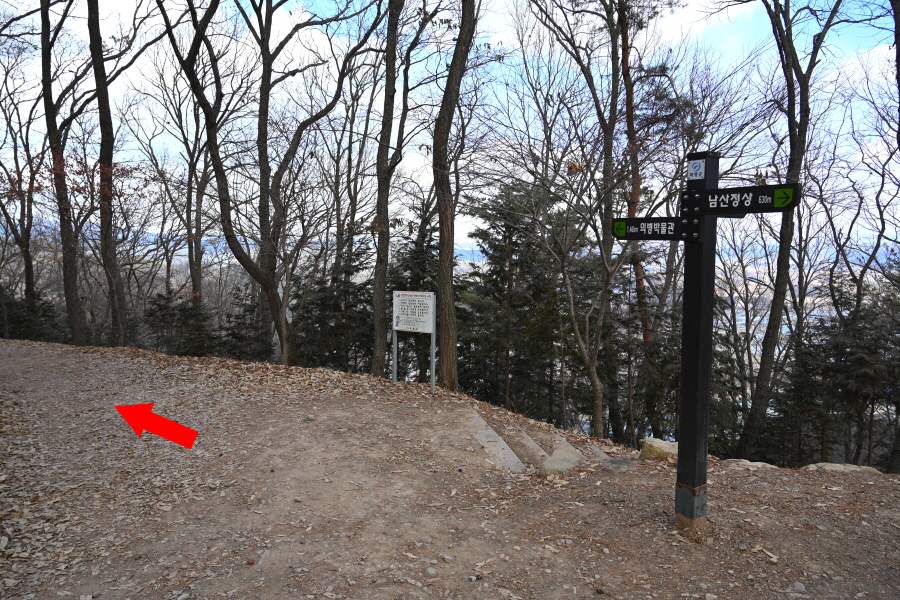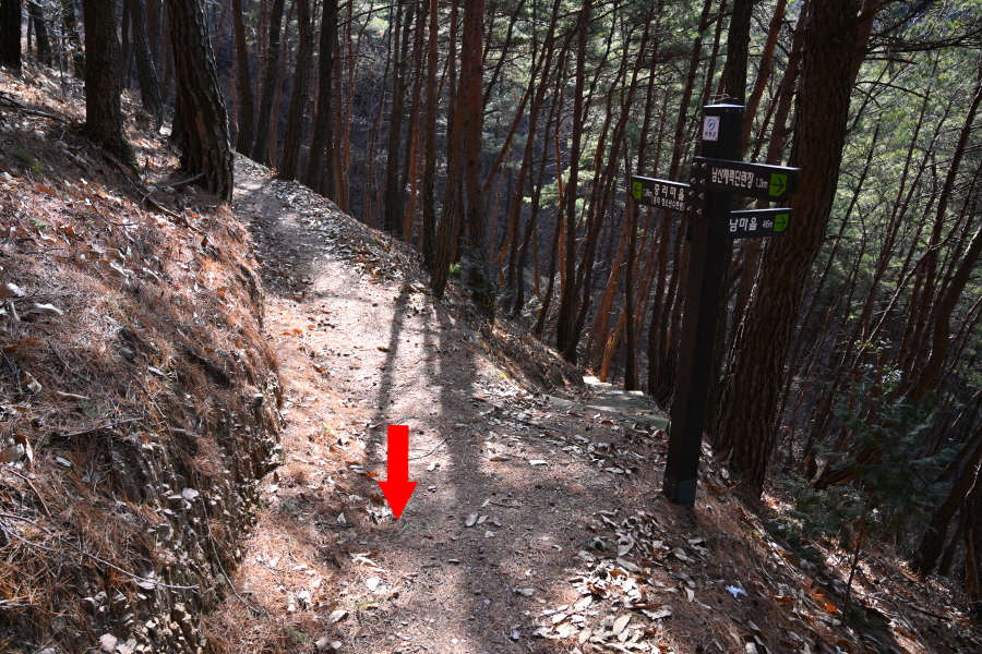 소나무 숲의 덱 쉼터를 지나 만세곡에서 약 20분이면 주능선에 올라 왼쪽 남산체육공원으로 갑니다. 오른쪽은 남산 정상 방향.