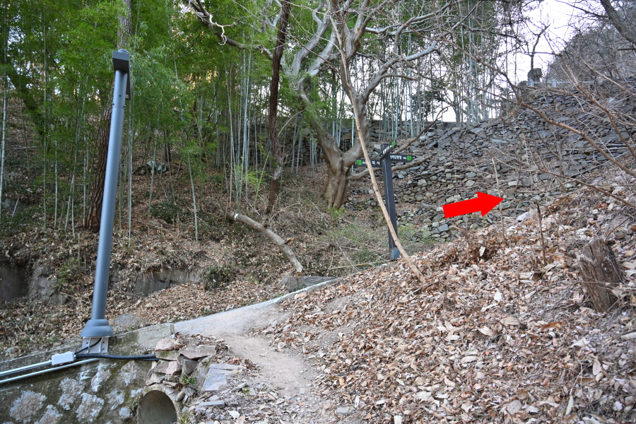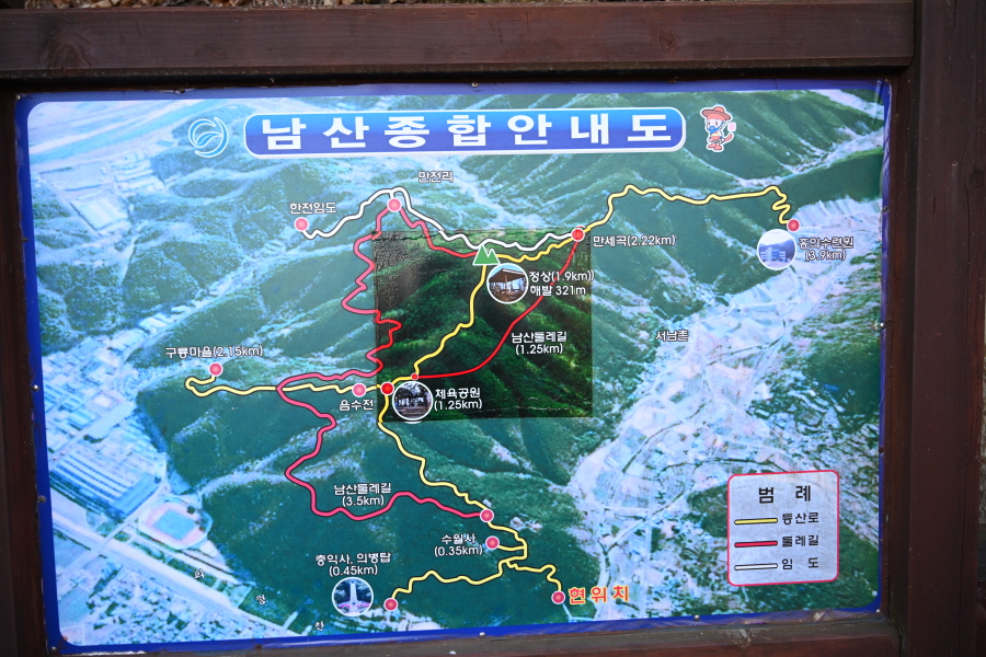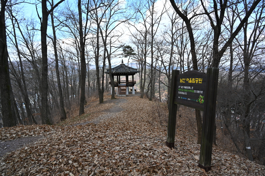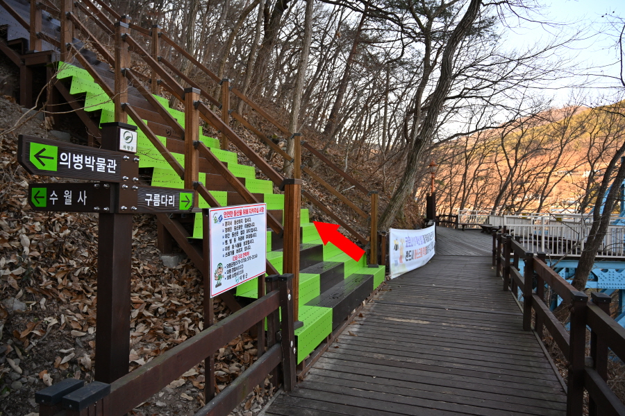 남산 종합 안내도가 세워진 갈림길에서 왼쪽이며, 바로 나오는 갈림길에서 오른쪽 수월사 방향 덱 계단을 오릅니다. 직진은 의병박물관 방향.