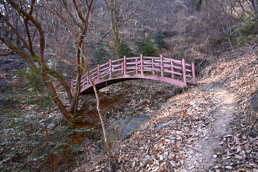 떡갈나무와 소나무 숲이 번갈아 나타나는 평탄한 산길은 계곡에 놓인 무지개다리를 잇달아 지납니다.