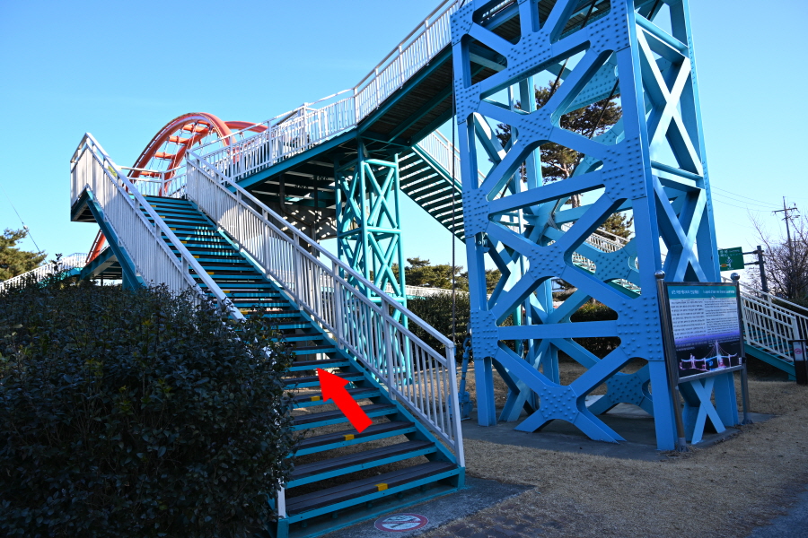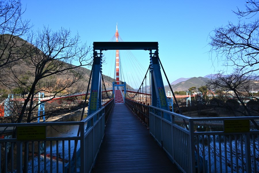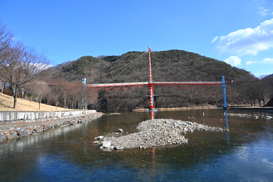이번 산행은 남산천과 의령천이 만나는 청실공원에서 출발합니다 의령구름다리로 연결되는 계단을 올라 주탑에서 왼쪽으로 건너갑니다. 세 방향으로 뻗은 구름다리의 색상과 주탑은 곽재우 장군의 붉은 옷과 의병탑을 형상화 했습니다,