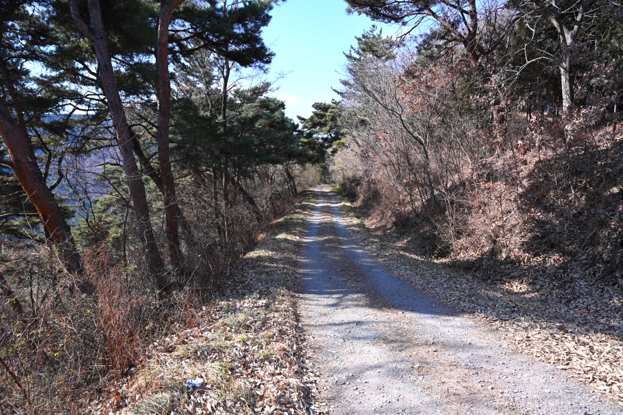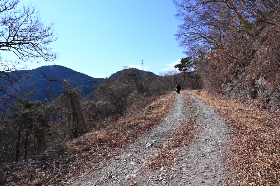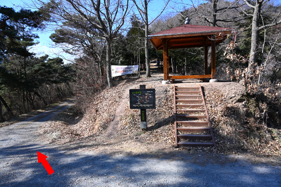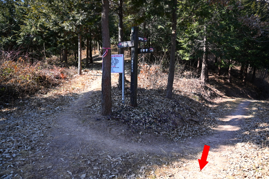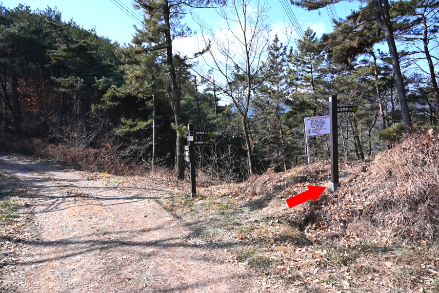 지그재그 산길은 콘크리트 임도에 올라 오른쪽 체력단련장(985m)으로 갑니다. 왼쪽은 충익사에서 올라오는 길.