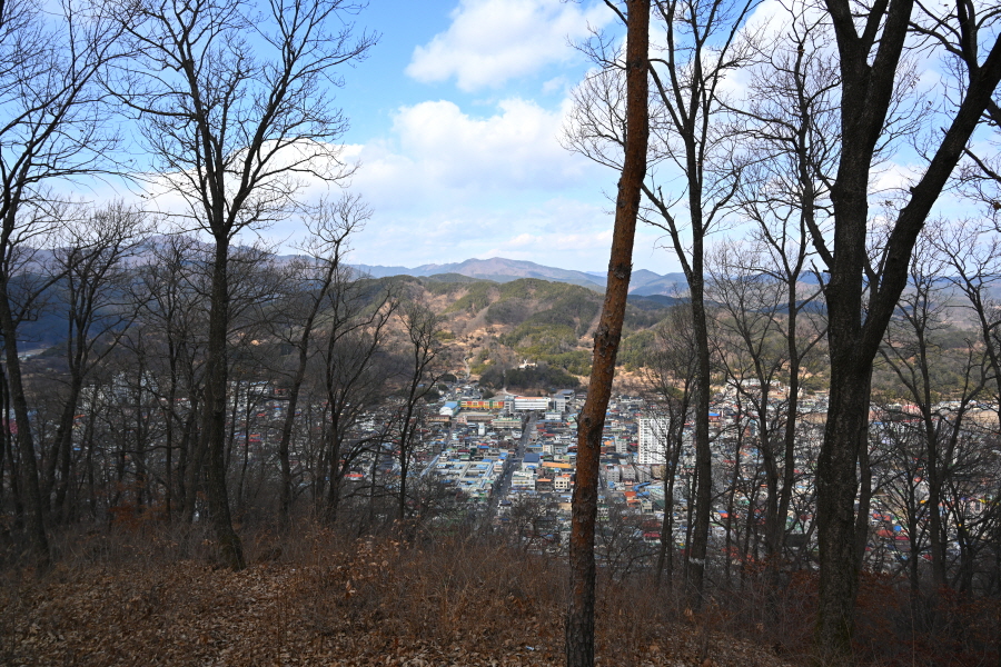 솔숲 길을 지나면 멀리 자굴산과 한우산 풍력단지, 발아래 의령읍 전경이 펼쳐지는 전망 덱이 나옵니다.