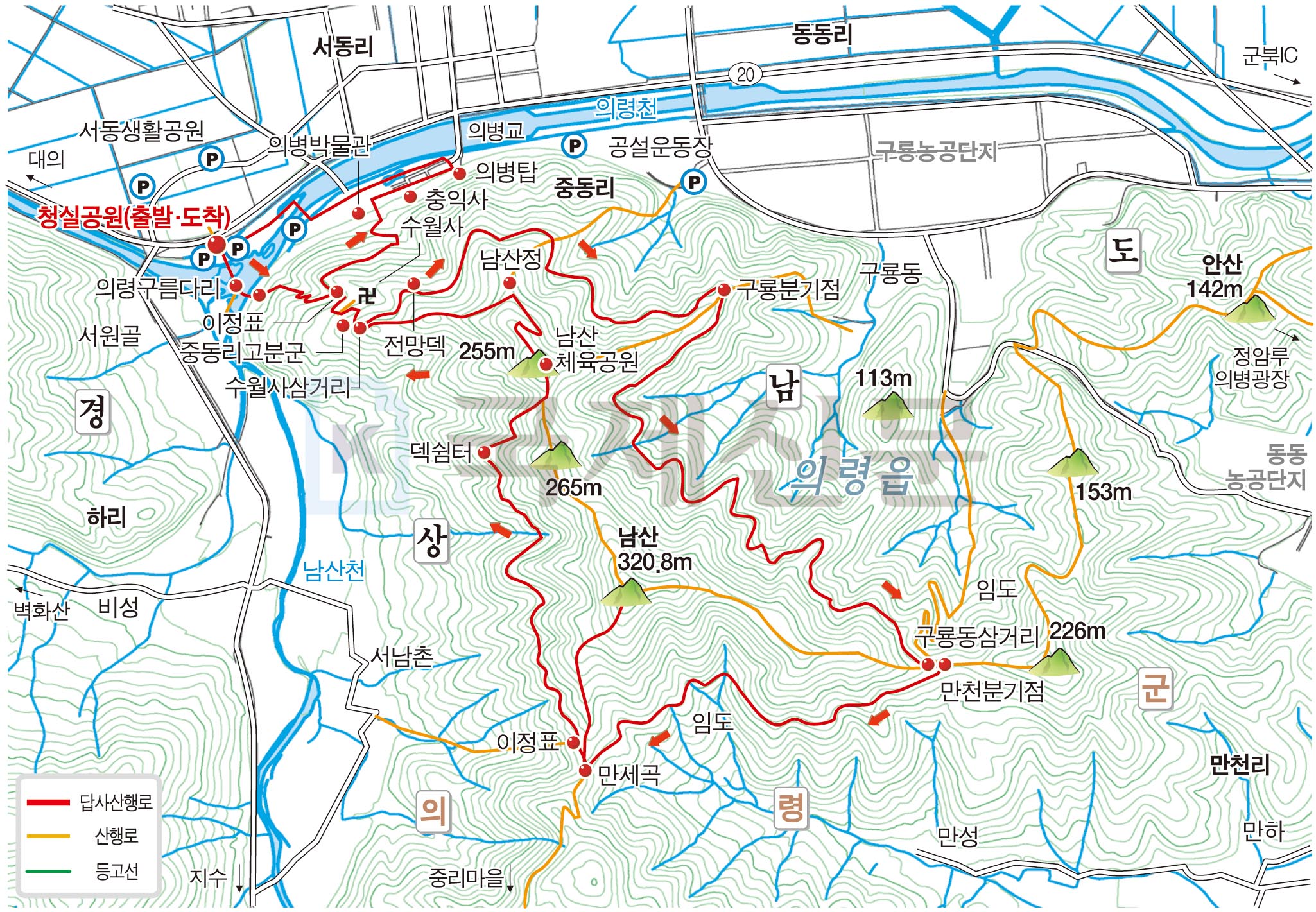 의령군 의령읍 청실공원에서 출발해 의령 구름다리~충익사·체력단련장 갈림길~수월사 입구~중동리고분군~수월사 갈림길~덱 전망대~구룡분기점~구룡동 삼거리~만천분기점~임도~만세곡~남산 정상~만세곡~서남마을·남산체력단련장 갈림길~덱 쉼터~남산정상·남산체육공원 갈림길~남산체육공원~남산정~수월사 갈림길~충익사·체력단련장 갈림길~충익사~의병박물관~잠수교~청실공원으로 되돌아오는 원점회귀입니다. 산행거리는 약 10.5㎞이며, 3시간 30분 안팎이 걸립니다.