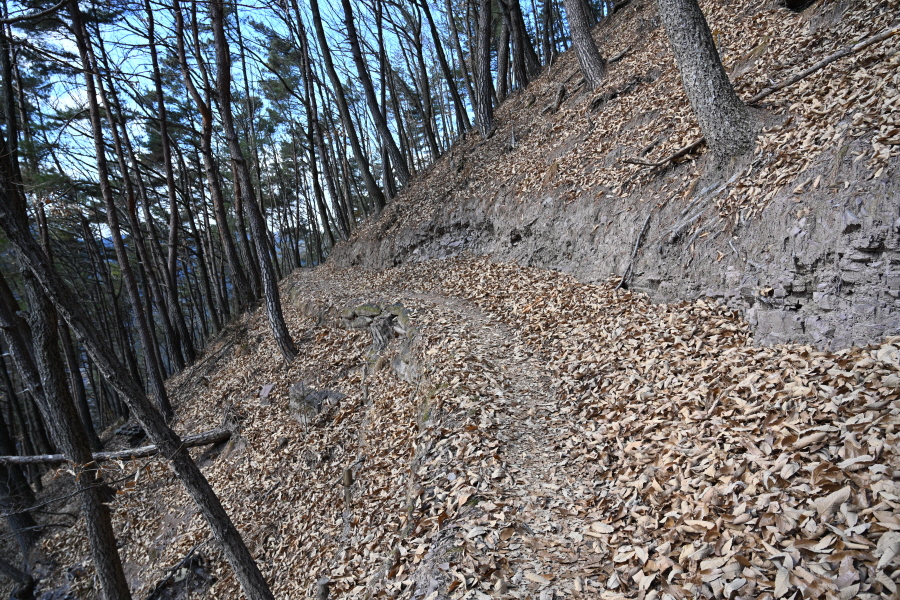 남산의 서쪽 사면은 상당히 가파른데다 퇴적암을 깨고 산길을 만들다 보니 잔돌이 많아 미끄러지지 않도록 합니다.